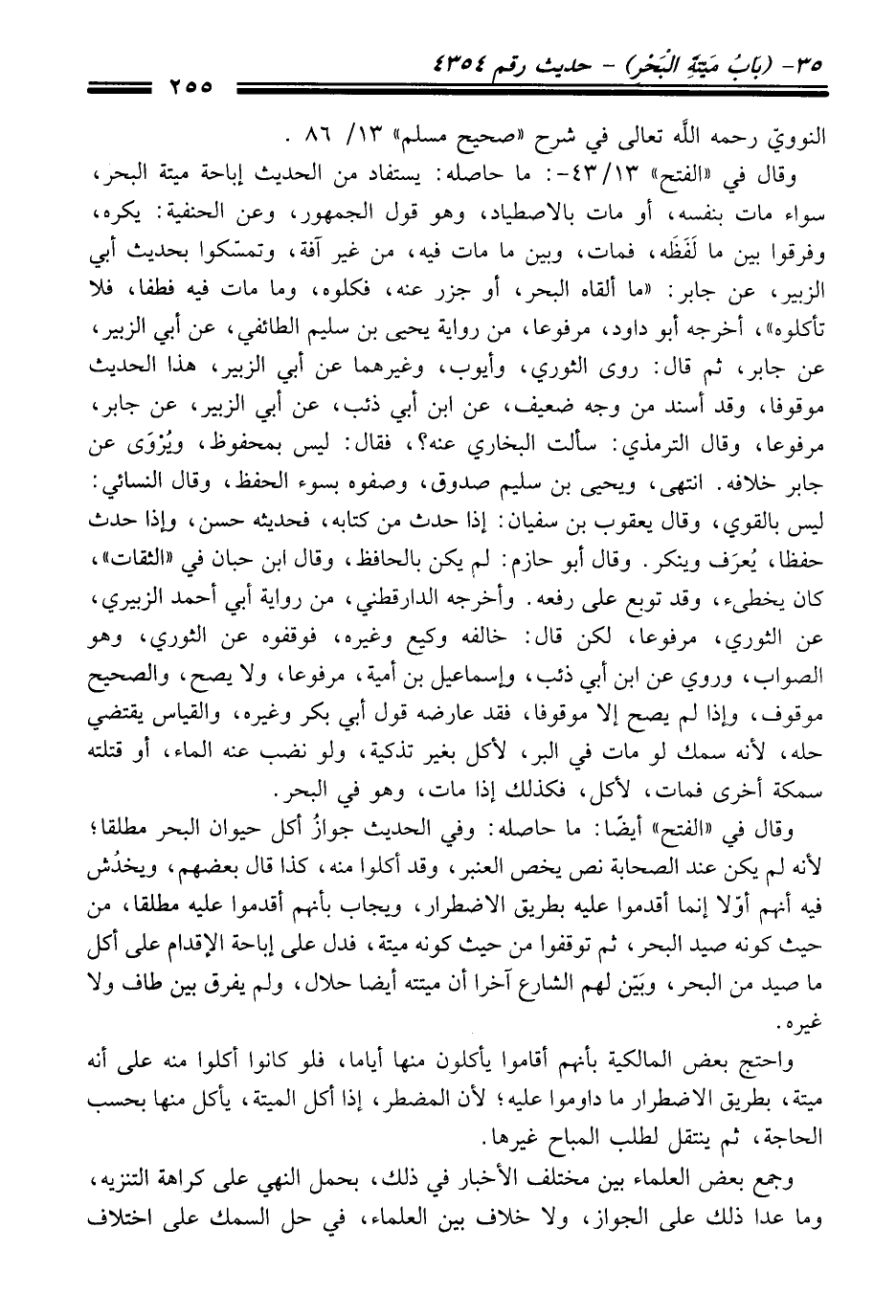 وَقَالَ فِي "الفتح" 13/ 43 - : ما حاصله: يستفاد منْ الْحَدِيث إباحة ميتة البحر، سواء مات بنفسه، أو مات بالاصطياد، وهو قول الجمهور، وعن الحنفية: يكره، وفرقوا بين ما لَفَظَه، فمات، وبين ما مات فيه، منْ غير آفة، وتمسّكوا بحديث أبي الزبير، عن جابر: "ما ألقاه البحر، أو جزر عنه، فكلوه، وما مات فيه فطفا، فلا تأكلوه"، أخرجه أبو داود، مرفوعًا، منْ رواية يحيى بن سليم الطائفي، عن أبي الزبير، عن جابر، ثم قَالَ: روى الثوري، وأيوب، وغيرهما عن أبي الزبير، هَذَا الْحَدِيث موقوفًا، وَقَدْ أسند منْ وجه ضعيف، عن ابن أبي ذئب، عن أبي الزبير، عن جابر، مرفوعًا، وَقَالَ الترمذي: سألت البخاريّ عنه؟، فَقَالَ: ليس بمحفوظ، ويُرْوَى عن جابر خلافه. انتهى، ويحيى بن سليم صدوق، وصفوه بسوء الحفظ، وَقَالَ النسائيّ: ليس بالقوي، وَقَالَ يعقوب بن سفيان: إذا حدث منْ كتابه، فحديثه حسن، وإذا حدث حفظا، يُعرَف وينكر. وَقَالَ أبو حازم: لم يكن بالحافظ، وَقَالَ ابن حبّان فِي "الثقات"، كَانَ يخطىء، وَقَدْ توبع عَلَى رفعه. وأخرجه الدارقطني، منْ رواية أبي أحمد الزبيري، عن الثوري، مرفوعًا، لكن قَالَ: خالفه وكيع وغيره، فوقفوه عن الثوري، وهو الصواب، وروي عن ابن أبي ذئب، وإسماعيل بن أمية، مرفوعًا، ولا يصح، والصحيح موقوف، وإذا لم يصح إلا موقوفًا، فقد عارضه قول أبي بكر وغيره، والقياس يقتضي حله؛ لأنه سمك لو مات فِي البر، لأكل بغير تذكية، ولو نضب عنه الماء، أو قتلته سمكة أخرى فمات، لأكل، فكذلك إذا مات، وهو فِي البحر.