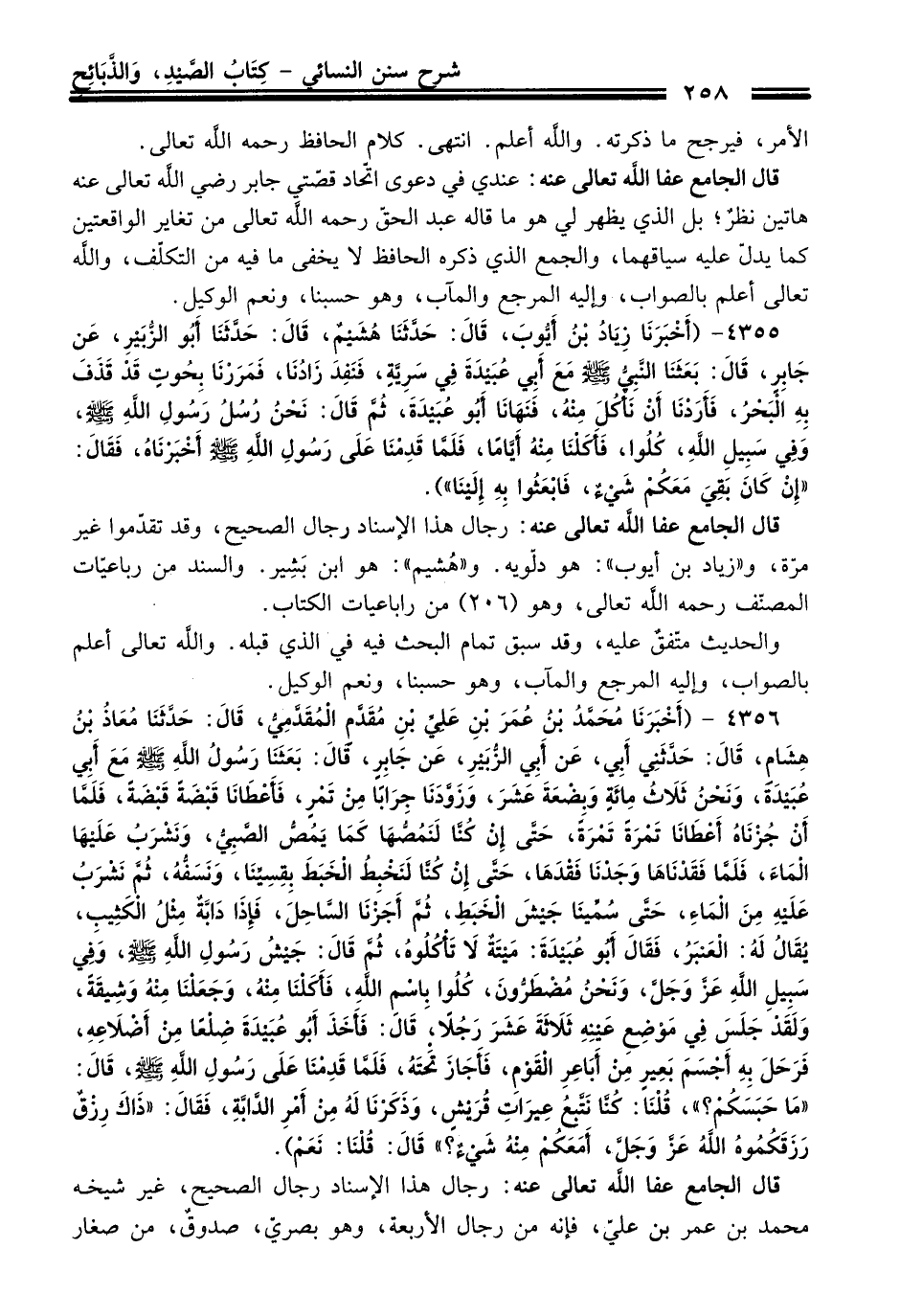 4356 - (أَخْبَرَنَا مُحَمَّدُ بْنُ عُمَرَ بْنِ عَلِيِّ بْنِ مُقَدَّمٍ الْمُقَدَّمِيُّ، قَالَ: حَدَّثَنَا مُعَاذُ بْنُ هِشَامٍ، قَالَ: حَدَّثَنِي أَبِي، عَنْ أَبِي الزُّبَيْرِ، عَنْ جَابِرٍ، قَالَ: بَعَثَنَا رَسُولُ اللَّهِ -صلى الله عليه وسلم- مَعَ أَبِي عُبَيْدَةَ، وَنَحْنُ ثَلاَثُمِائَةٍ وَبِضْعَةَ عَشَرَ، وَزَوَّدَنَا جِرَابًا مِنْ تَمْرٍ، فَأَعْطَانَا قَبْضَةً قَبْضَةً، فَلَمَّا أَنْ جُزْنَاهُ أَعْطَانَا تَمْرَةً تَمْرَةً، حَتَّى إِنْ كُنَّا لَنَمُصُّهَا كَمَا يَمُصُّ الصَّبِيُّ، وَنَشْرَبُ عَلَيْهَا الْمَاءَ، فَلَمَّا فَقَدْنَاهَا وَجَدْنَا فَقْدَهَا، حَتَّى إِنْ كُنَّا لَنَخْبِطُ الْخَبَطَ بِقِسِيِّنَا، وَنَسَفُّهُ، ثُمَّ نَشْرَبُ عَلَيْهِ مِنَ الْمَاءِ، حَتَّى سُمِّينَا جَيْشَ الْخَبَطِ، ثُمَّ أَجَزْنَا السَّاحِلَ، فَإِذَا دَابَّةٌ مِثْلُ الْكَثِيبِ، يُقَالُ لَهُ: الْعَنْبَرُ، فَقَالَ أَبُو عُبَيْدَةَ: مَيْتَةٌ لاَ تَأْكُلُوهُ، ثُمَّ قَالَ: جَيْشُ رَسُولِ اللَّهِ -صلى الله عليه وسلم-، وَفِى سَبِيلِ اللَّهِ عَزَّ وَجَلَّ، وَنَحْنُ مُضْطَرُّونَ، كُلُوا بِاسْمِ اللَّهِ، فَأَكَلْنَا مِنْهُ، وَجَعَلْنَا مِنْهُ وَشِيقَةً، وَلَقَدْ جَلَسَ فِي مَوْضِعِ عَيْنِهِ ثَلاَثَةَ عَشَرَ رَجُلاً، قَالَ: فَأَخَذَ أَبُو عُبَيْدَةَ ضِلَعًا مِنْ أَضْلاَعِهِ، فَرَحَلَ بِهِ أَجْسَمَ بَعِيرٍ مِنْ أَبَاعِرِ الْقَوْمِ، فَأَجَازَ تَحْتَهُ، فَلَمَّا قَدِمْنَا عَلَى رَسُولِ اللَّهِ -صلى الله عليه وسلم-، قَالَ: "مَا حَبَسَكُمْ؟ "، قُلْنَا: كُنَّا نَتَّبِعُ عِيرَاتِ قُرَيْشٍ، وَذَكَرْنَا لَهُ مِنْ أَمْرِ الدَّابَّةِ، فَقَالَ: "ذَاكَ رِزْقٌ رَزَقَكُمُوهُ اللَّهُ عَزَّ وَجَلَّ، أَمَعَكُمْ مِنْهُ شَيْءٌ؟ "، قَالَ: قُلْنَا: نَعَمْ).