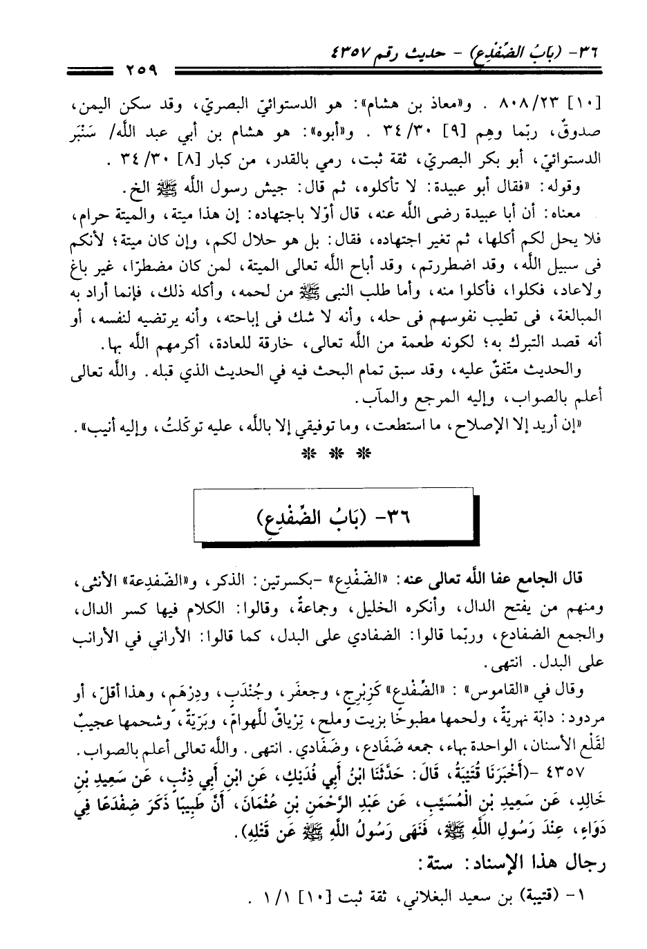 4357 - (أَخْبَرَنَا قُتَيْبَةُ، قَالَ: حَدَّثَنَا ابْنُ أَبِي فُدَيْكٍ، عَنِ ابْنِ أَبِي ذِئْبٍ، عَنْ سَعِيدِ بْنِ خَالِدٍ، عَنْ سَعِيدِ بْنِ الْمُسَيَّبِ، عَنْ عَبْدِ الرَّحْمَنِ بْنِ عُثْمَانَ، أَنَّ طَبِيبًا ذَكَرَ ضِفْدَعًا فِي دَوَاءٍ، عِنْدَ رَسُولِ اللَّهِ -صلى الله عليه وسلم-، فَنَهَى رَسُولُ اللَّهِ -صلى الله عليه وسلم- عَنْ قَتْلِهِ).