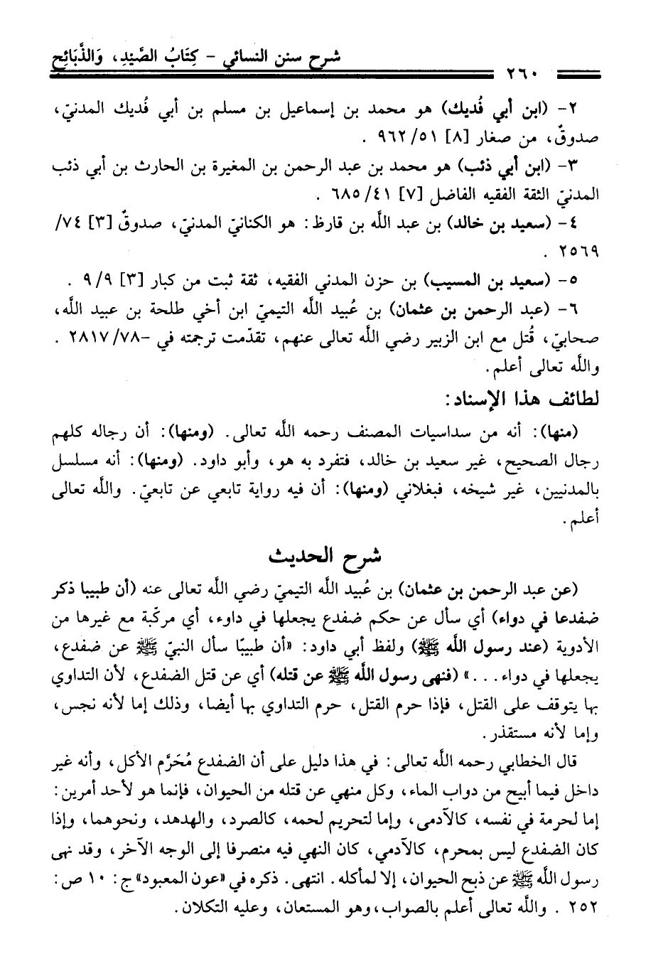 (عن عبد الرحمن بن عثمان) بن عُبيد الله التيميّ رضي الله تعالى عنه (أن طبيبا ذكر ضفدعا فِي دواء) أي سأل عن حكم ضفدع يجعلها فِي داوء، أي مركّبة مع غيرها منْ الأدوية (عند رسول الله -صلى الله عليه وسلم-) ولفظ أبي داود: "أن طبيبًا سأل النبيّ -صلى الله عليه وسلم- عن ضفدع، يجعلها فِي دواء ... " (فنهى رسول الله -صلى الله عليه وسلم- عن قتله) أي عن قتل الضفدع؛ لأن التداوي بها يتوقف عَلَى القتل، فإذا حرم القتل، حرم التداوي بها أيضًا، وذلك إما لأنه نجس، وإما لأنه مستقذر.