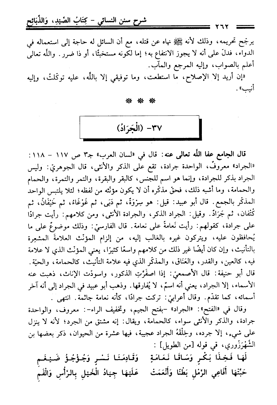 وَقَالَ فِي "الفتح": "الجراد" -بفتح الجيم، وتخفيف الراء-: معروف، والواحدة جرادة، والذكر والأنثى سواء، كالحمامة، ويقال: إنه مشتق منْ الجرد؛ لأنه لا ينزل عَلَى شيء، إلا جرده، وخِلْقَهُ الجراد عجيبة، فيها عشرة منْ الحيوان، ذكر بعضها بن الشَّهْرَزُوري، فِي قوله [منْ الطويل]: