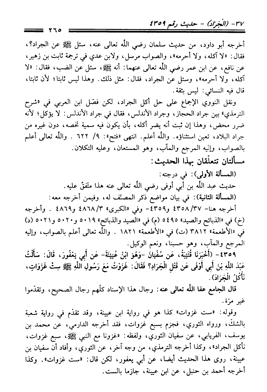 4359 - (أَخْبَرَنَا قُتَيْبَةُ، عَنْ سُفْيَانَ -وَهُوَ ابْنُ عُيَيْنَةَ- عَنْ أَبِي يَعْفُورٍ، قَالَ: سَأَلْتُ عَبْدَ اللَّهِ بْنَ أَبِي أَوْفَى عَنْ قَتْلِ الْجَرَادِ؟ فَقَالَ: غَزَوْتُ مَعَ رَسُولِ اللَّهِ -صلى الله عليه وسلم- سِتَّ غَزَوَاتٍ، نَأْكُلُ الْجَرَادَ).