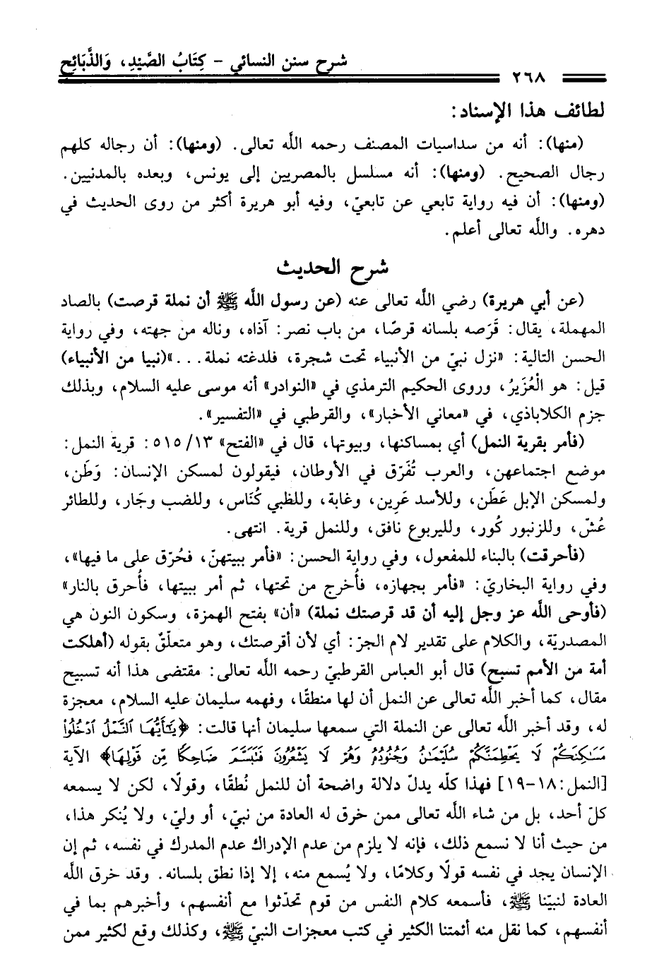 (عن أبي هريرة) رضي الله تعالى عنه (عن رسول الله -صلى الله عليه وسلم- أن نملة قرصت) بالصاد المهملة، يقال: قَرَصه بلسانه قرصًا، منْ باب نصر: آذاه، وناله منْ جهته، وفي رواية الحسن التالية: "نزل نبيّ منْ الأنبياء تحت شجرة، فلدغته نملة ... " (نبيا منْ الأنبياء) قيل: هو الْعُزَيرُ، وروى الحكيم الترمذي فِي "النوادر" أنه موسى عليه السلام، وبذلك جزم الكلاباذي، فِي "معاني الأخبار"، والقرطبي فِي "التفسير".