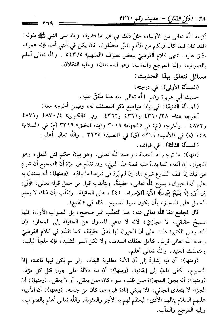 (منها): ما ترجم له المصنّف رحمه الله تعالى، وهو بيان حكم قتل النمل، وهو الجواز، إن آذته، كما يدل عليه قصة هَذَا النبيّ، وَقَدْ تقدّم غير مرّة أن الصحيح أن شرع منْ قبلنا إذا قصّه الشارع شرع لنا، إذا لم يَرِدْ فِي شرعنا ما ينافيه. (ومنها): أنه يستدل به عَلَى أن الحيوان، يسبح الله تعالى، حقيقةً، ويتأيد به قول منْ حمل قوله تعالى: {وَإِنْ مِنْ شَيْءٍ إِلَّا يُسَبِّحُ بِحَمْدِهِ} الآية [الإسراء: 44]، عَلَى الحقيقة. وتُعُقّب بأن ذلك لا يمنع الحمل عَلَى المجاز، بأن يكون سببا للتسبيح. قاله فِي "الفتح".