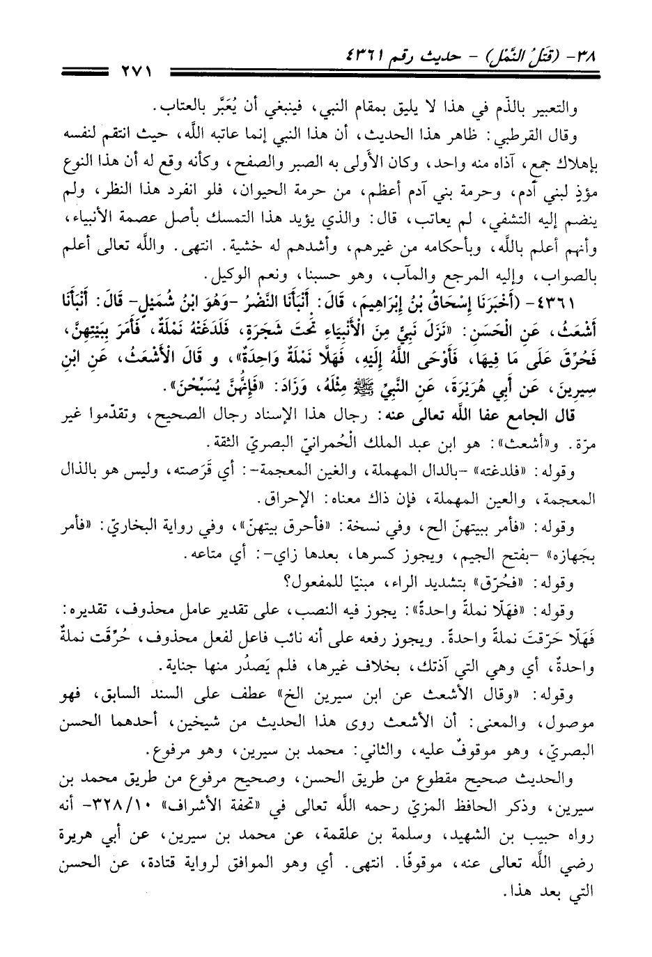 4361 - (أَخْبَرَنَا إِسْحَاقُ بْنُ إِبْرَاهِيمَ، قَالَ: أَنْبَأَنَا النَّضْرُ -وَهُوَ ابْنُ شُمَيْلٍ- قَالَ: أَنْبَأَنَا أَشْعَثُ، عَنِ الْحَسَنِ: "نَزَلَ نَبِيٌّ مِنَ الأَنْبِيَاءِ تَحْتَ شَجَرَةٍ، فَلَدَغَتْهُ نَمْلَةٌ، فَأَمَرَ بِبَيْتِهِنَّ، فَحُرِّقَ عَلَى مَا فِيهَا، فَأَوْحَى اللَّهُ إِلَيْهِ، فَهَلاَّ نَمْلَةً وَاحِدَةً"، وَقَالَ الأَشْعَثُ، عَنِ ابْنِ سِيرِينَ، عَنْ أَبِي هُرَيْرَةَ، عَنِ النَّبِيِّ -صلى الله عليه وسلم- مِثْلَهُ، وَزَادَ: "فَإِنَّهُنَّ يُسَبِّحْنَ").