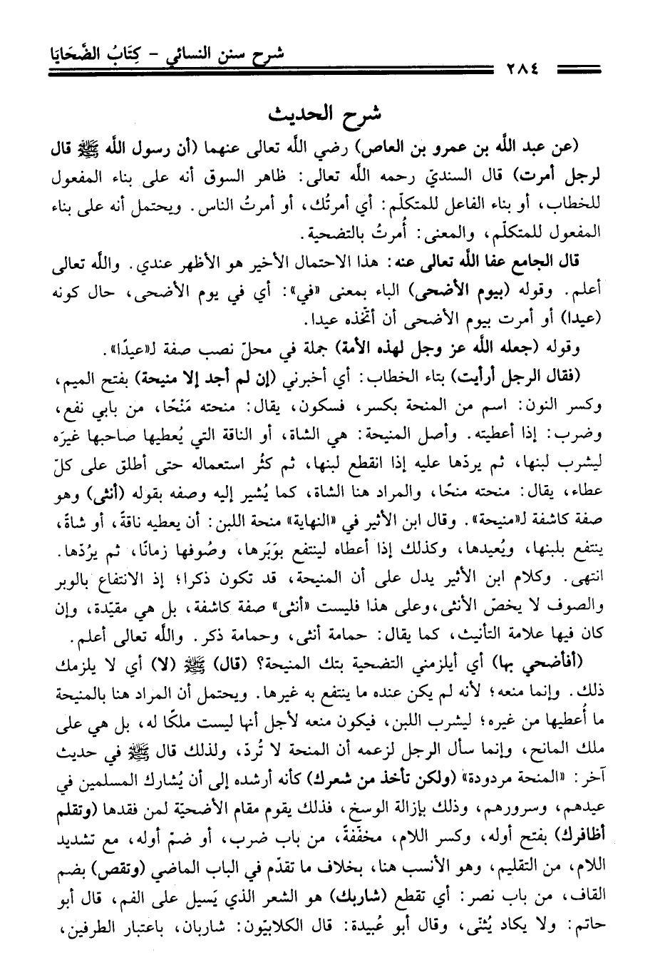 (أفاضحي بها) أي أيلزمني التضحية بتلك المنيحة؟ (قَالَ) -صلى الله عليه وسلم- (لا) أي لا يلزمك ذلك. وإنما منعه؛ لأنه لم يكن عنده ما ينتفع به غيرها. ويحتمل أن المراد هنا بالمنيحة ما أُعطيها منْ غيره؛ ليشرب اللبن، فيكون منعه لأجل أنها ليست ملكًا له، بل هي عَلَى ملك المانح، وإنما سأل الرجل لزعمه أن المنحة لا تُردّ، ولذلك قَالَ -صلى الله عليه وسلم- فِي حديث آخر: "المنحة مردودة" (ولكن تأخذ منْ شعرك) كأنه أرشده إلى أن يُشارك المسلمين فِي عيدهم، وسرورهم، وذلك بإزالة الوسخ، فذلك يقوم مقام الأضحية لمن فقدها (وتقلم أظافرك) بفتح أوله، وكسر اللام، مخفّفةً، منْ باب ضرب، أو ضمّ أوله، مع تشديد اللام، منْ التقليم، وهو الإنسب هنا، بخلاف ما تقدّم فِي الباب الماضي (وتقص) بضم القاف، منْ باب نصر: أي تقطع (شاربك) هو الشعر الذي يَسيل عَلَى الفم، قَالَ أبو حاتم: ولا يكاد يُثنّى، وَقَالَ أبو عُبيدة: قَالَ الكلابيّون: شاربان، باعتبار الطرفين،