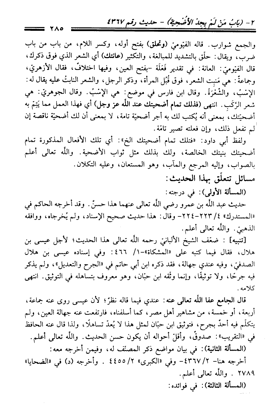 [تنبيه]: ضعّف الشيخ الألبانيّ رحمه الله تعالى هَذَا الْحَدِيث؛ لأجل عيسى بن هلال، فَقَالَ فيما كتبه عَلَى "المشكاة" -1/ 466: وفي إسناده عيسى بن هلال الصدفيّ، وفيه عندي جهالة، فقد ذكره ابن أبي حاتم فِي "الجرح والتعديل"، ولم يذكر فيه جرحًا، ولا توثيقًا، وإنما وثقه ابن حبّان، وهو معروف بتساهله فِي التوثيق. انتهى كلامه.