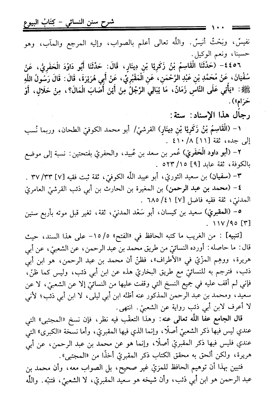 قَالَ الجامع عفا الله تعالى عنه: وهذا التعقّب فيه نظر، فإن نسخ "المجتبى" التي عندي ليس فيها ذكر الشعبيّ أصلاً، وإنما الذي فيها المقبريّ، وأما نسخة "الكبرى" التي عندي فليس فيها ذكر المقبريّ أصلاً، وإنما هو عن محمد بن عبد الرحمن، عن أبي هريرة، ولكن ألحق به محقق الكتاب ذكر المقبريّ أخذًا منْ "المجتبى".