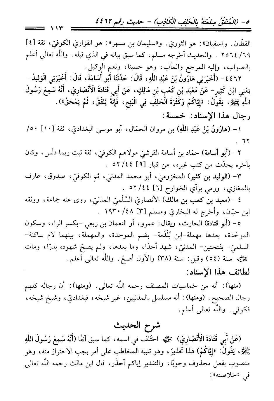4462 - (أَخْبَرَنِي هَارُونُ بْنُ عَبْدِ اللَّهِ، قَالَ: حَدَّثَنَا أَبُو أُسَامَةَ، قَالَ: أَخْبَرَنِي الْوَلِيدُ -يَعْنِي ابْنَ كَثِيرٍ- عَنْ مَعْبَدِ بْنِ كَعْبِ بْنِ مَالِكٍ، عَنْ أَبِي قَتَادَةَ الأَنْصَارِيِّ، أَنَّهُ سَمِعَ رَسُولَ اللَّهِ -صلى الله عليه وسلم- يَقُولُ: "إِيَّاكُمْ وَكَثْرَةَ الْحَلِفِ فِي الْبَيْعِ، فَإِنَّهُ يُنَفِّقُ، ثُمَّ يَمْحَقُ").