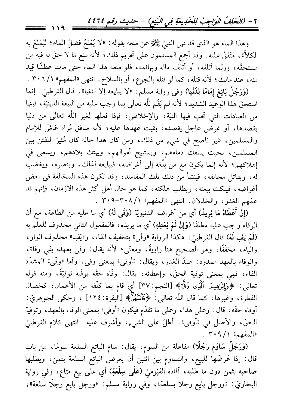 (وَرَجُلٌ بَايَعَ إِمَامًا لِدُنْيَا) وفي رواية مسلم: "لا يبايعه إلا لدنيا"، قَالَ القرطبيّ: إنما استحقّ هَذَا الوعيد الشديد؛ لأنه لم يَقُم لله تعالى بما وجب عليه منْ البيعة الدينيّة، فإنها منْ العبادات التي تجب فيها النيّة، والإخلاص، فإذا فعلها لغير الله تعالى منْ دنيا يقصدها، أو غرض عاجل يقصده، بقيت عهدها عليه؛ لأنه منافق مُراء غاشّ للإمام والمسلمين، غير ناصح فِي شيء منْ ذلك، ومن كَانَ هَذَا حاله كَانَ مُثيرًا للفتن بين المسلمين، بحيث يسفك دماءهم، ويستبيح أموالهم، ويهتك بلادهم، ويسعى فِي إهلاكهم؛ لأنه إنما يكون مع منْ بلّغه إلى أغراضه، فيبايعه لذلك، وينصره، ويغضب له، ويقاتل مخالفه، فينشأ منْ ذلك تلك المفاسد، وَقَدْ تكون هذه المخالفة فِي بعض أغراضه، فينكث بيعته، ويطلب هلكته، كما هو حال أهل أكثر هذه الأزمان، فإنهم قد عمّهم الغدر، والخذلان. انتهى "المفهم" 1/ 308 - 309.