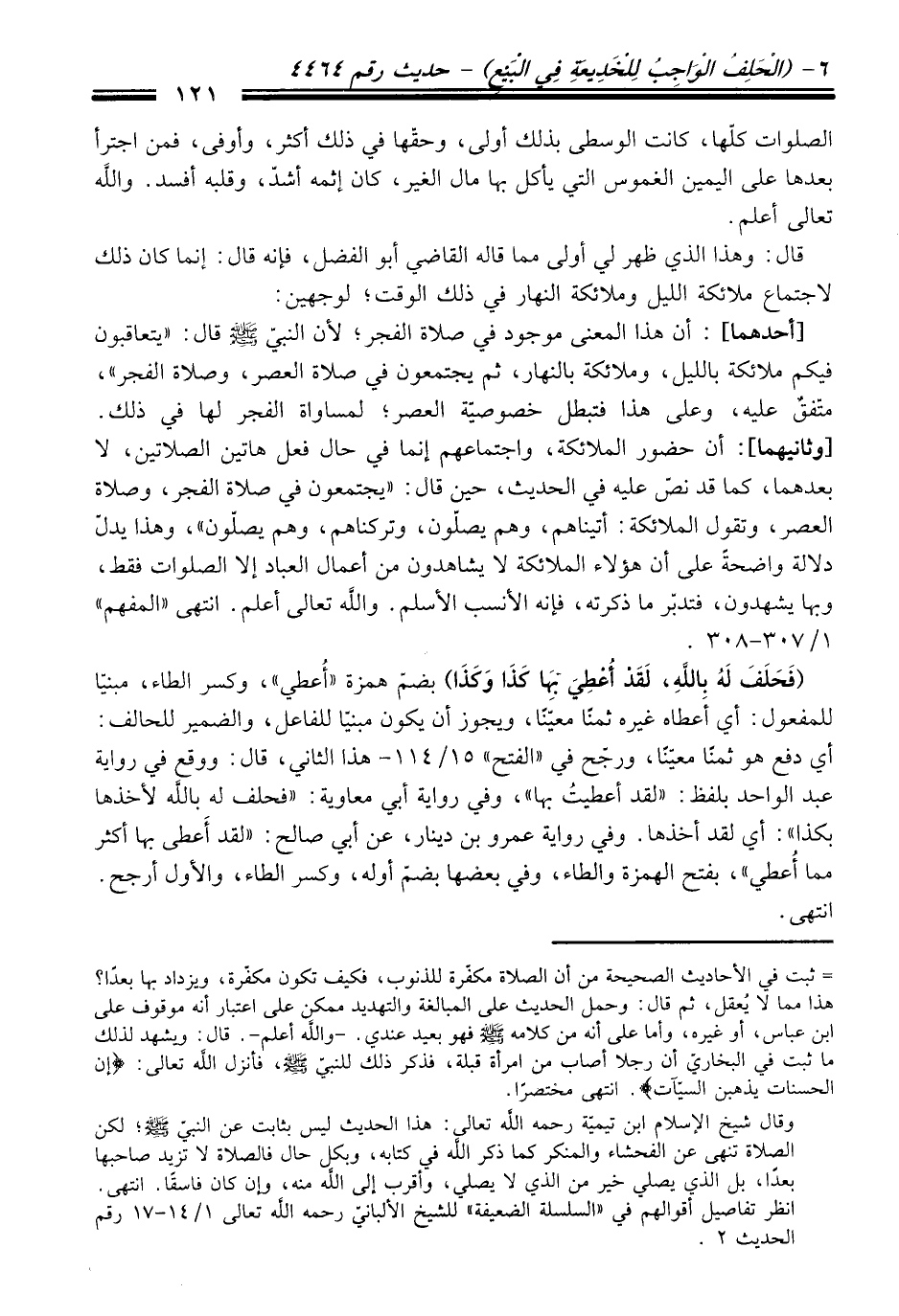 الصلوات كلّها، كانت الوسطى بذلك أولى، وحقّها فِي ذلك أكثر، وأوفى، فمن اجترأ بعدها عَلَى اليمين الغموس التي يأكل بها مال الغير، كَانَ إثمه أشدّ، وقلبه أفسد. والله تعالى أعلم.