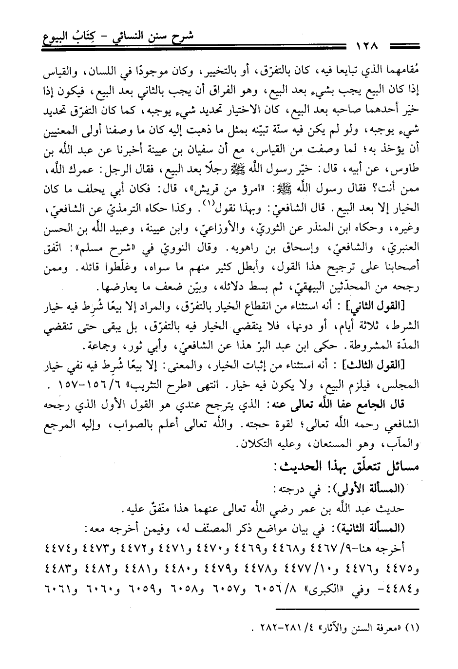 مُقامهما الذي تبايعا فيه، كَانَ بالتفرّق، أو بالتخيير، وكان موجودًا فِي اللسان، والقياس إذا كَانَ البيع يجب بشيء بعد البيع، وهو الفراق أن يجب بالثاني بعد البيع، فيكون إذا خيّر أحدهما صاحبه بعد البيع، كَانَ الاختيار تحديد شيء يوجبه، كما كَانَ التفرّق تحديد شيء يوجبه، ولو لم يكن فيه سنة تبيّنه بمثل ما ذهبت إليه كَانَ ما وصفنا أولى المعنيين أن يؤخذ به؛ لما وصفت منْ القياس، مع أن سفيان بن عيينة أخبرنا عن عبد الله بن طاوس، عن أبيه، قَالَ: خيّر رسول الله -صلى الله عليه وسلم- رجلاً بعد البيع، فَقَالَ الرجل: عمرك الله، ممن أنت؟ فَقَالَ رسول الله -صلى الله عليه وسلم-: "امرؤ منْ قريش"، قَالَ: فكان أبي يحلف ما كَانَ الخيار إلا بعد البيع. قَالَ الشافعيّ: وبهذا نقول (¬1). وكذا حكاه الترمذيّ عن الشافعيّ، وغيره، وحكاه ابن المنذر عن الثوريّ، والأوزاعيّ، وابن عيينة، وعبيد الله بن الحسن العنبريّ، والشافعيّ، وإسحاق بن راهويه. وَقَالَ النوويّ فِي "شرح مسلم": اتّفق أصحابنا عَلَى ترجيح هَذَا القول، وأبطل كثير منهم ما سواه، وغلّطوا قائله. وممن رجحه منْ المحدّثين البيهقيّ، ثم بسط دلائله، وبيّن ضعف ما يعارضها.
