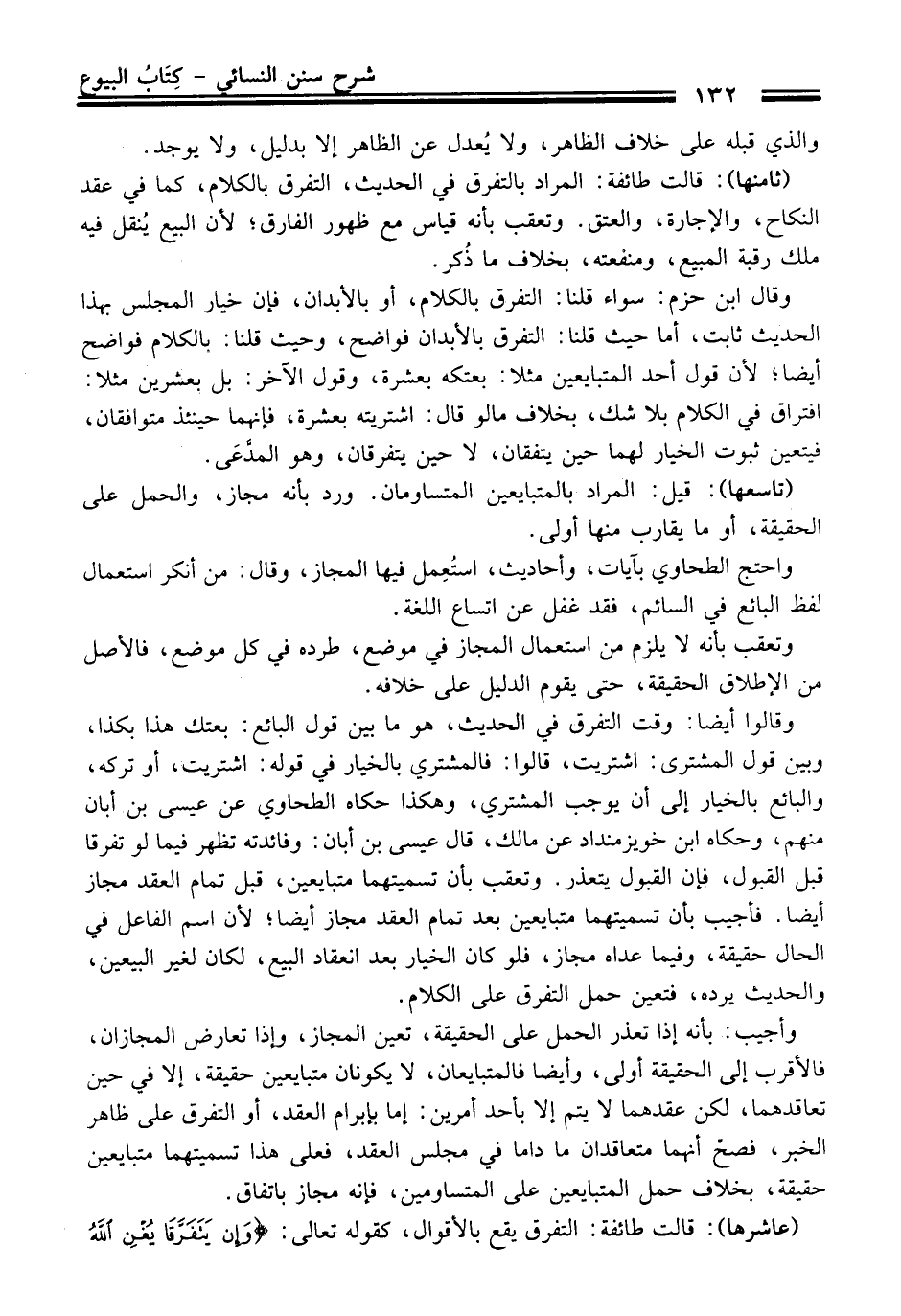 (ثامنها): قالت طائفة: المراد بالتفرق فِي الْحَدِيث، التفرق بالكلام، كما فِي عقد النكاح، والإجارة، والعتق. وتعقب بأنه قياس مع ظهور الفارق؛ لأن البيع يُنقل فيه ملك رقبة المبيع، ومنفعته، بخلاف ما ذُكر.