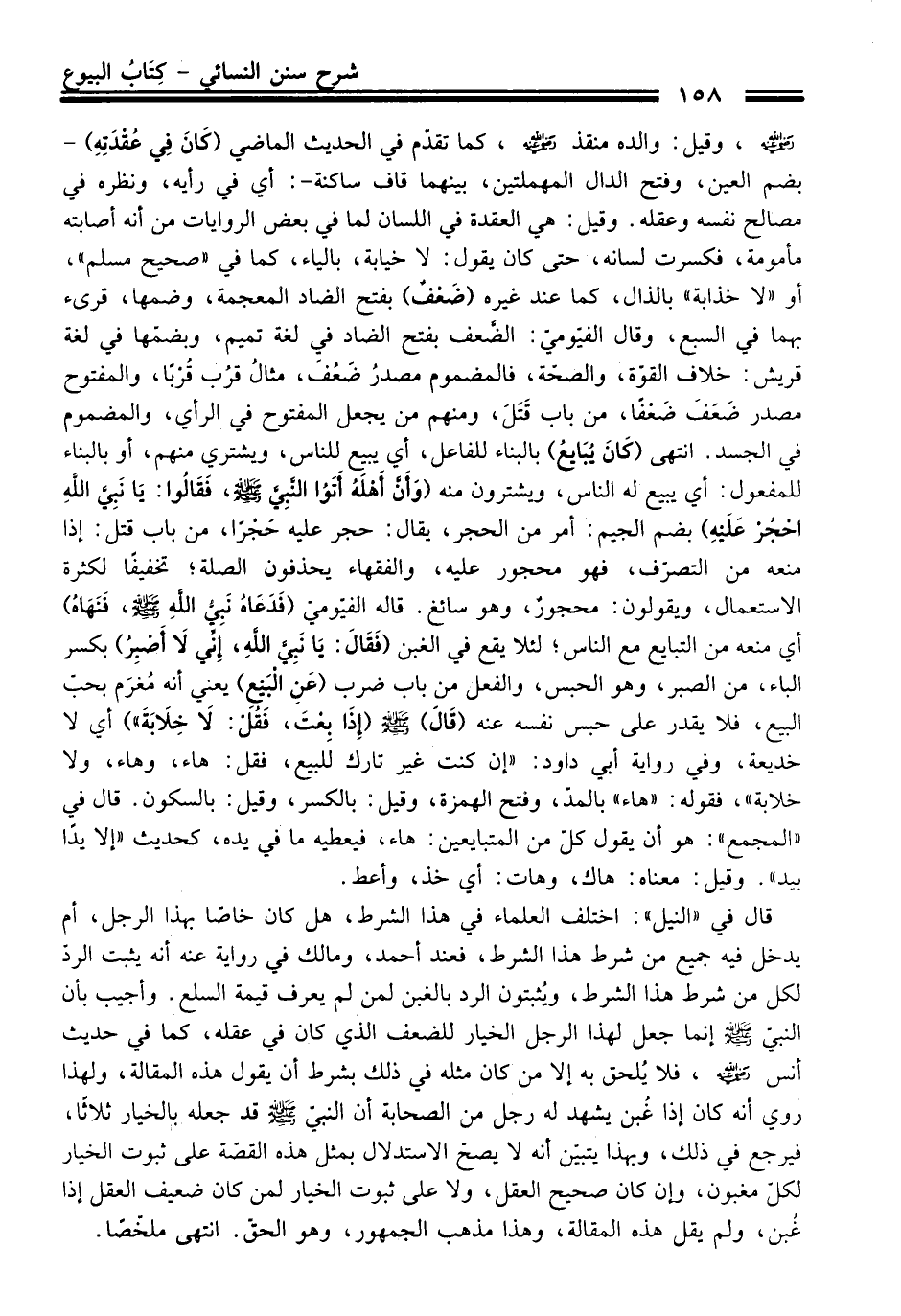 -رضي الله عنه-، وقيل: والده منقذ -رضي الله عنه-، كما تقدّم فِي الْحَدِيث الماضي (كَانَ فِي عُقْدَتِهِ) -بضم العين، وفتح الدال المهملتين، بينهما قاف ساكنة-: أي فِي رأيه، ونظره فِي مصالح نفسه وعقله. وقيل: هي العقدة فِي اللسان لما فِي بعض الروايات منْ أنه أصابته مأمومة، فكسرت لسانه، حَتَّى كَانَ يقول: لا خيابة، بالياء، كما فِي "صحيح مسلم"، أو "لا خذابة" بالذال، كما عند غيره (ضَعْفٌ) بفتح الضاد المعجمة، وضمها، قرىء بهما فِي السبع، وَقَالَ الفيّوميّ: الضَّعف بفتح الضاد فِي لغة تميم، وبضمّها فِي لغة قريش: خلاف القوّة، والصحّة، فالمضموم مصدرُ ضَعُفَ، مثالُ قرُب قُرْبًا، والمفتوح مصدر ضَعَفَ ضَعْفًا، منْ باب قَتَلَ، ومنهم منْ يجعل المفتوح فِي الرأي، والمضموم فِي الجسد. انتهى (كَانَ يُبَايعُ) بالبناء للفاعل، أي يبيع للناس، ويشتري منهم، أو بالبناء للمفعول: أي يبيع له النَّاس، ويشترون منه (وَأَنَّ أَهْلَهُ أَتَوُا النَّبِيَّ -صلى الله عليه وسلم-، فَقَالُوا: يَا نَبِيَّ الله احْجُرْ عَلَيهِ) بضم الجيم: أمر منْ الحجر، يقال: حجر عليه حَجْرًا، منْ باب قتل: إذا منعه منْ التصرّف، فهو محجور عليه، والفقهاء يحذفون الصلة؛ تخفيفًا لكثرة الاستعمال، ويقولون: محجورٌ، وهو سائغ. قاله الفيّوميّ (فَدَعَاهُ نَبِيُّ اللهِ -صلى الله عليه وسلم-، فَنَهَاهُ) أي منعه منْ التبايع مع النَّاس؛ لئلا يقع فِي الغبن (فَقَالَ: يَا نَبِيَّ اللهِ، إِنِّي لَا أَصْبِرُ) بكسر الباء، منْ الصبر، وهو الحبس، والفعل منْ باب ضرب (عَنِ الْبَيْعِ) يعني أنه مُغرَم بحبّ البيع، فلا يقدر عَلَى حبس نفسه عنه (قَالَ) -صلى الله عليه وسلم- (إِذَا بعْتَ، فَقُل: لَا خِلَابَةَ") أي لا خديعة، وفي رواية أبي داود: "إن كنت غير تارك للبيع، فقل: هاء، وهاء، ولا خلابة"، فقوله: "هاء" بالمدّ، وفتح الهمزة، وقيل: بالكسر، وقيل: بالسكون. قَالَ فِي "المجمع": هو أن يقول كلّ منْ المتبايعين: هاء، فيعطيه ما فِي يده، كحديث "إلا يداً بيد". وقيل: معناه: هاك، وهات: أي خذ، وأعط.