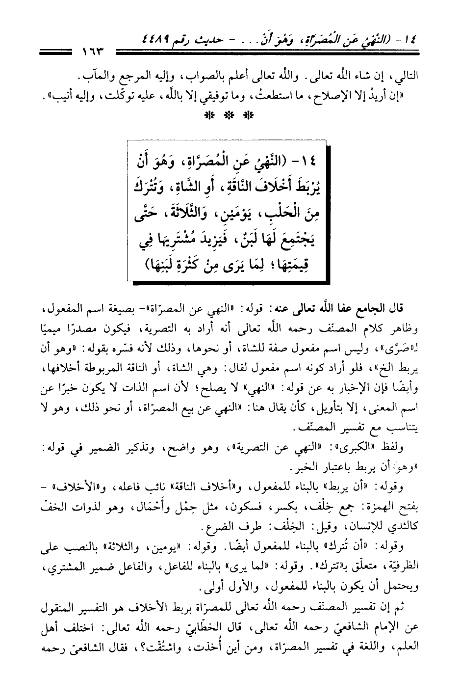 قَالَ الجامع عفا الله تعالى عنه: قوله: "النهي عن المصرّاة" -بصيغة اسم المفعول، وظاهر كلام المصنّف رحمه الله تعالى أنه أراد به التصرية، فيكون مصدرًا ميميًا لـ"صَرَّى"، وليس اسم مفعول صفة للشاة، أو نحوها، وذلك لأنه فسّره بقوله: "وهو أن يربط الخ"، فلو أراد كونه اسم مفعول لقال: وهي الشاة، أو الناقة المربوطة أخلافها، وأيضاً فإن الإخبار به عن قوله: "النهي" لا يصلح؛ لأن اسم الذات لا يكون خبرًا عن اسم المعنى، إلا بتأويل، كأن يقال هنا: "النهي عن بيع المصرّاة، أو نحو ذلك، وهو لا يتناسب مع تفسير المصنّف.