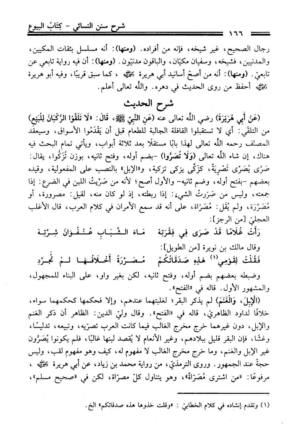 (عَنْ أَبِي هُرَيْرَةَ) رضي الله تعالى عنه (عَنِ النَّبِيِّ -صلى الله عليه وسلم-، قالَ: "لَا تَلَقَّوُا الرُّكْبَانَ لِلْبَيْعِ) منْ التلقي: أي لا تستقبلوا القافلة الجالبة للطعام قبل أن يَقْدَمُوا الأسواق، وسيعقد المصنّف رحمه الله تعالى لهذا بابًا مستقلاً بعد ثلاثة أبواب، ويأتي تمام البحث فيه هناك، إن شاء الله تعالى (وَلَا تُصَرُّوا) -بضم أوله، وفتح ثانيه، بوزن تُزَكُوا، يقال: صَرَّى يُصَرِّى تَصْرِيَةً، كزَكَّى يزكى تزكية، و"الإبل" بالنصب عَلَى المفعولية، وقيده بعضهم -بفتح أوله، وضم ثانيه- والأول أصح؛ لأنه منْ صَرَّيتُ اللبن فِي الضرع: إذا جمعته، وليس منْ صَرَرتُ الشيءَ: إذا ربطته، إذ لو كَانَ منه، لقيل: مصرورة، أو مُصَرَّرَة، ولم يُقَل: مُصَرّاة، عَلَى أنه قد سمع الأمران فِي كلام العرب، قَالَ الأغلب العجليّ [منْ الرجز]: