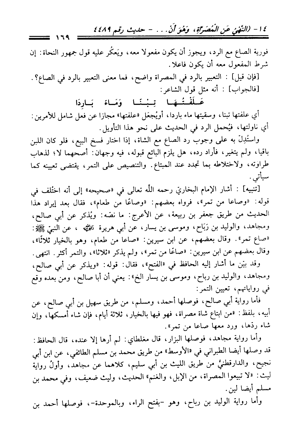 واستُدِلّ به عَلَى وجوب رد الصاع مع الشاة، إذا اختار فسخ البيع، فلو كَانَ اللبن باقيا، ولم يتغير، فأراد رده، هل يلزم البائع قبوله، فيه وجهان: أصحهما لا؛ لذهاب طراوته، ولاختلاطه بما تجدد عند المبتاع. والتنصيص عَلَى التمر، يقتضى تعيينه كما سيأتي.