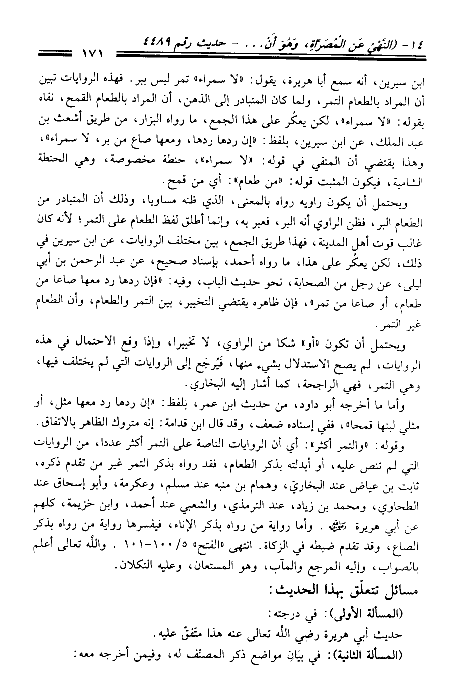 ابن سيرين، أنه سمع أبا هريرة، يقول: "لا سمراء" تمر ليس ببر. فهذه الروايات تبين أن المراد بالطعام التمر، ولما كَانَ المتبادر إلى الذهن، أن المراد بالطعام القمح، نفاه بقوله: "لا سمراء"، لكن يعكُر عَلَى هَذَا الجمع، ما رواه البزار، منْ طريق أشعث بن عبد الملك، عن ابن سيرين، بلفظ: "إن ردها ردها، ومعها صاع منْ بر، لا سمراء"، وهذا يقتضي أن المنفي فِي قوله: "لا سمراء"، حنطة مخصوصة، وهي الحنطة الشامية، فيكون المثبت قوله: "منْ طعام": أي منْ قمح.