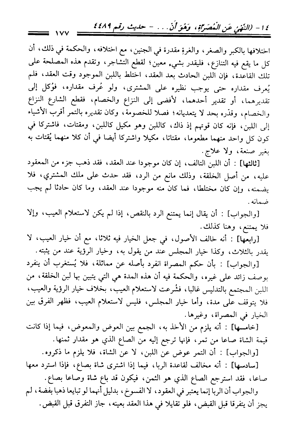 [خامسها]: أنه يلزم منْ الأخذ به، الجمع بين العوض والمعوض، فيما إذا كانت قيمة الشاة صاعا منْ تمر، فإنها ترجع إليه منْ الصاع الذي هو مقدار ثمنها.