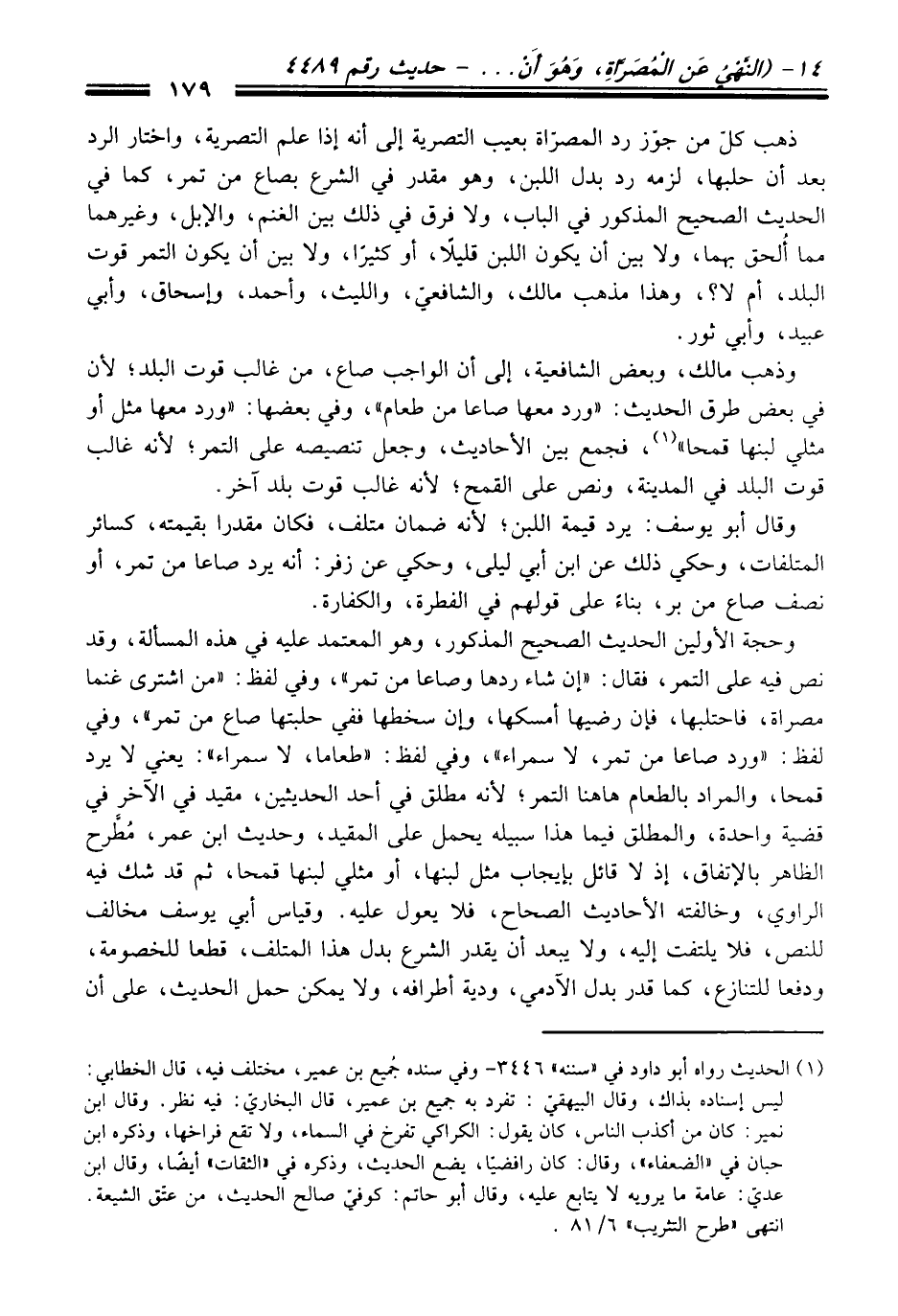 وحجة الأولين الْحَدِيث الصحيح المذكور، وهو المعتمد عليه فِي هذه المسألة، وَقَدْ نص فيه عَلَى التمر، فَقَالَ: "إن شاء ردها وصاعا منْ تمر"، وفي لفظ: "منْ اشترى غنما مصراة، فاحتلبها، فإن رضيها أمسكها، وإن سخطها ففي حلبتها صاع منْ تمر"، وفي لفظ: "ورد صاعا منْ تمر، لا سمراء"، وفي لفظ: "طعاما، لا سمراء": يعني لا يرد قمحا، والمراد بالطعام هاهنا التمر؛ لأنه مطلق فِي أحد الحديثين، مقيد فِي الآخر فِي قضية واحدة، والمطلق فيما هَذَا سبيله يحمل عَلَى المقيد، وحديث ابن عمر، مُطرح الظاهر بالإتفاق، إذ لا قائل بإيجاب مثل لبنها، أو مثلي لبنها قمحا، ثم قد شك فيه الراوي، وخالفته الأحاديث الصحاح، فلا يعول عليه. وقياس أبي يوسف مخالف للنص، فلا يلتفت إليه، ولا يبعد أن يقدر الشرع بدل هَذَا المتلف، قطعا للخصومة، ودفعا للتنازع، كما قدر بدل الآدمي، ودية أطرافه، ولا يمكن حمل الْحَدِيث، عَلَى أن