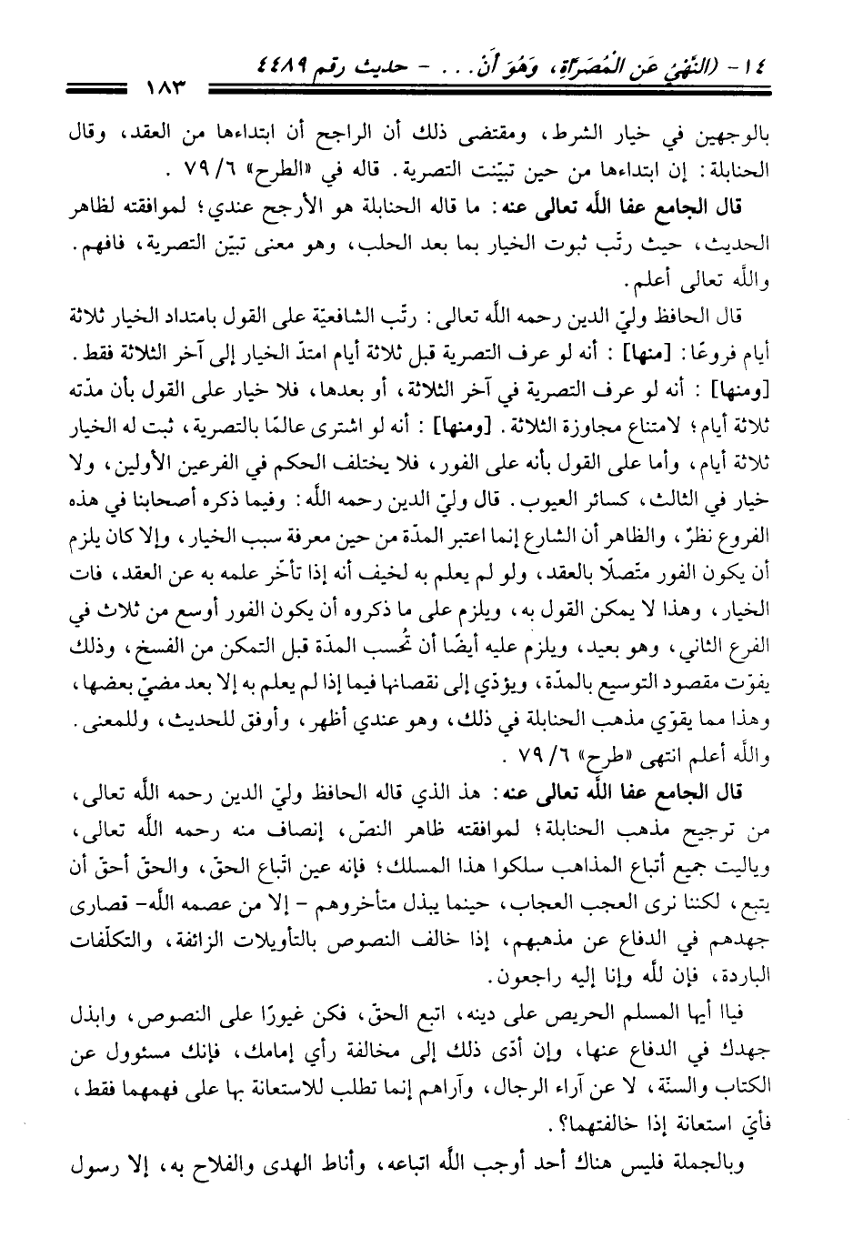 قَالَ الجامع عفا الله تعالى عنه: هذ الذي قاله الحافظ ولي الدين رحمه الله تعالى، منْ ترجيح مذهب الحنابلة؛ لموافقته ظاهر النصّ، إنصاف منه رحمه الله تعالى، وياليت جميع أتباع المذاهب سلكوا هَذَا المسلك؛ فإنه عين اتّباع الحقّ، والحقّ أحقّ أن يتبع، لكننا نرى العجب العجاب، حينما يبذل متأخروهم -إلا منْ عصمه الله- قصارى جهدهم فِي الدفاع عن مذهبهم، إذا خالف النصوص بالتأويلات الزائفة، والتكلّفات الباردة، فإن لله وإنا إليه راجعون.