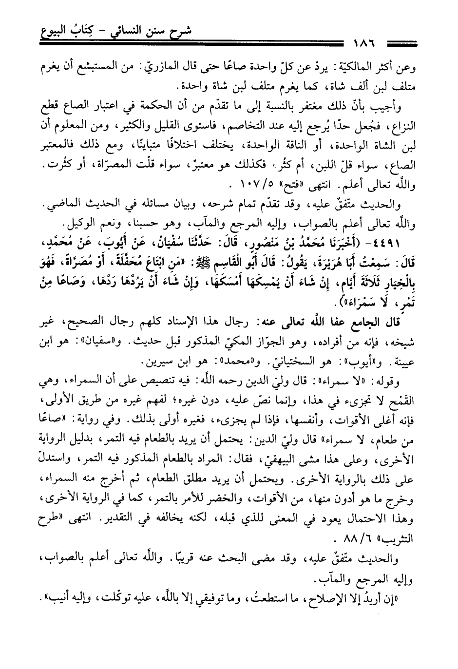 4491 - (أَخْبَرَنَا مُحَمَّدُ بْنُ مَنْصُورٍ، قَالَ: حَدَّثَنَا سُفْيَانُ، عَنْ أَيُّوبَ، عَنْ مُحَمَّدٍ، قَالَ: سَمِعْتُ أَبَا هُرَيْرَةَ، يَقُولُ: قَالَ أَبُو الْقَاسِمِ -صلى الله عليه وسلم-: "مَنِ ابْتَاعَ مُحَفَّلَةً، أَوْ مُصَرَّاةً، فَهُوَ بِالْخِيَارِ ثَلاَثَةَ أَيَّامٍ، إِنْ شَاءَ أَنْ يُمْسِكَهَا أَمْسَكَهَا، وَإِنْ شَاءَ أَنْ يَرُدَّهَا رَدَّهَا، وَصَاعًا مِنْ تَمْرٍ، لاَ سَمْرَاءَ").