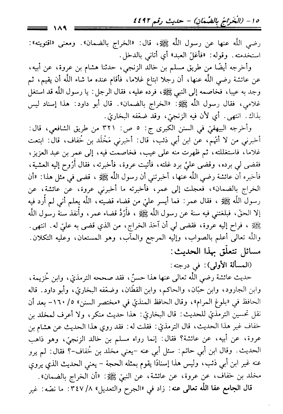 حديث عائشة رضي الله تعالى عنها هَذَا حسنٌ، فقد صححه الترمذيّ، وابن خُزيمة، وابن الجارود، وابن حبّان، والحاكم، وابن القطّان، وضعفه البخاريّ، وأبو داود. قاله الحافظ فِي "بلوغ المرام"، وَقَالَ الحافظ المنذريّ فِي "مختصر السنن" 5/ 160 - بعد أن نقل تحسين الترمذيّ للحديث: قَالَ البخاريّ: هَذَا حديث منكر، ولا أعرف لمخلد بن خفاف غير هَذَا الْحَدِيث، قَالَ الترمذيّ: فقلت له: فقد روي هَذَا الْحَدِيث عن هشام بن عروة، عن أبيه، عن عائشة؟ فَقَالَ: إنما رواه مسلم بن خالد الزنجيّ، وهو ذاهب الْحَدِيث. وَقَالَ ابن أبي حاتم: سئل أبي عنه -يعني مخلد بن خُفاف-؟ فَقَالَ: لم يرو عنه غير ابن أبي ذئب، وليس هَذَا إسنادًا يقوم بمثله الحجة -يعني الْحَدِيث الذي يروي مخلد بن خفاف، عن عروة، عن عائشة، عن النبيّ -صلى الله عليه وسلم-: "أن الخراج بالضمان".