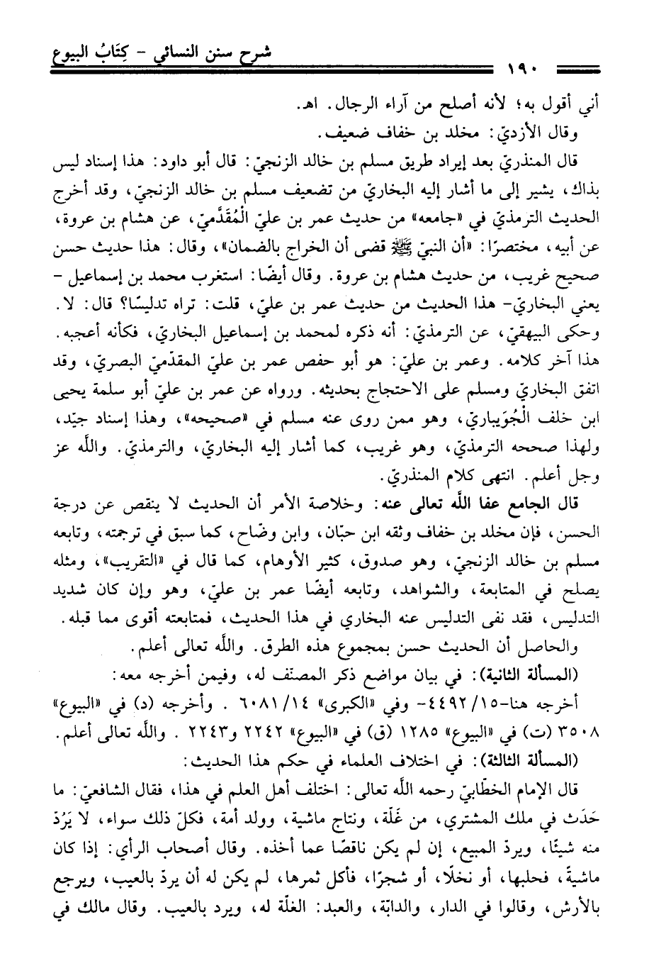 قَالَ المنذريّ بعد إيراد طريق مسلم بن خالد الزنجيّ: قَالَ أبو داود: هَذَا إسناد ليس بذاك، يشير إلى ما أشار إليه البخاريّ منْ تضعيف مسلم بن خالد الزنجيّ، وَقَدْ أخرج الْحَدِيث الترمذيّ فِي "جامعه" منْ حديث عمر بن علي الْمُقَدَّميّ، عن هشام بن عروة، عن أبيه، مختصرًا: "أن النبيّ -صلى الله عليه وسلم- قضى أن الخراج بالضمان"، وَقَالَ: هَذَا حديث حسن صحيح غريب، منْ حديث هشام بن عروة. وَقَالَ أيضًا: استغرب محمّد بن إسماعيل -يعني البخاريّ- هَذَا الْحَدِيث منْ حديث عمر بن عليّ، قلت: تراه تدليسًا؟ قَالَ: لا. وحكى البيهقيّ، عن الترمذيّ: أنه ذكره لمحمد بن إسماعيل البخاريّ، فكأنه أعجبه. هَذَا آخر كلامه. وعمر بن عليّ: هو أبو حفص عمر بن عليّ المقدّميّ البصريّ، وَقَدْ اتفق البخاريّ ومسلم عَلَى الاحتجاج بحديثه. ورواه عن عمر بن علي أبو سلمة يحيى ابن خلف الْجُوَيباريّ، وهو ممن روى عنه مسلم فِي "صحيحه"، وهذا إسناد جيّد، ولهذا صححه الترمذيّ، وهو غريب، كما أشار إليه البخاريّ، والترمذيّ. والله عز وجل أعلم. انتهى كلام المنذريّ.