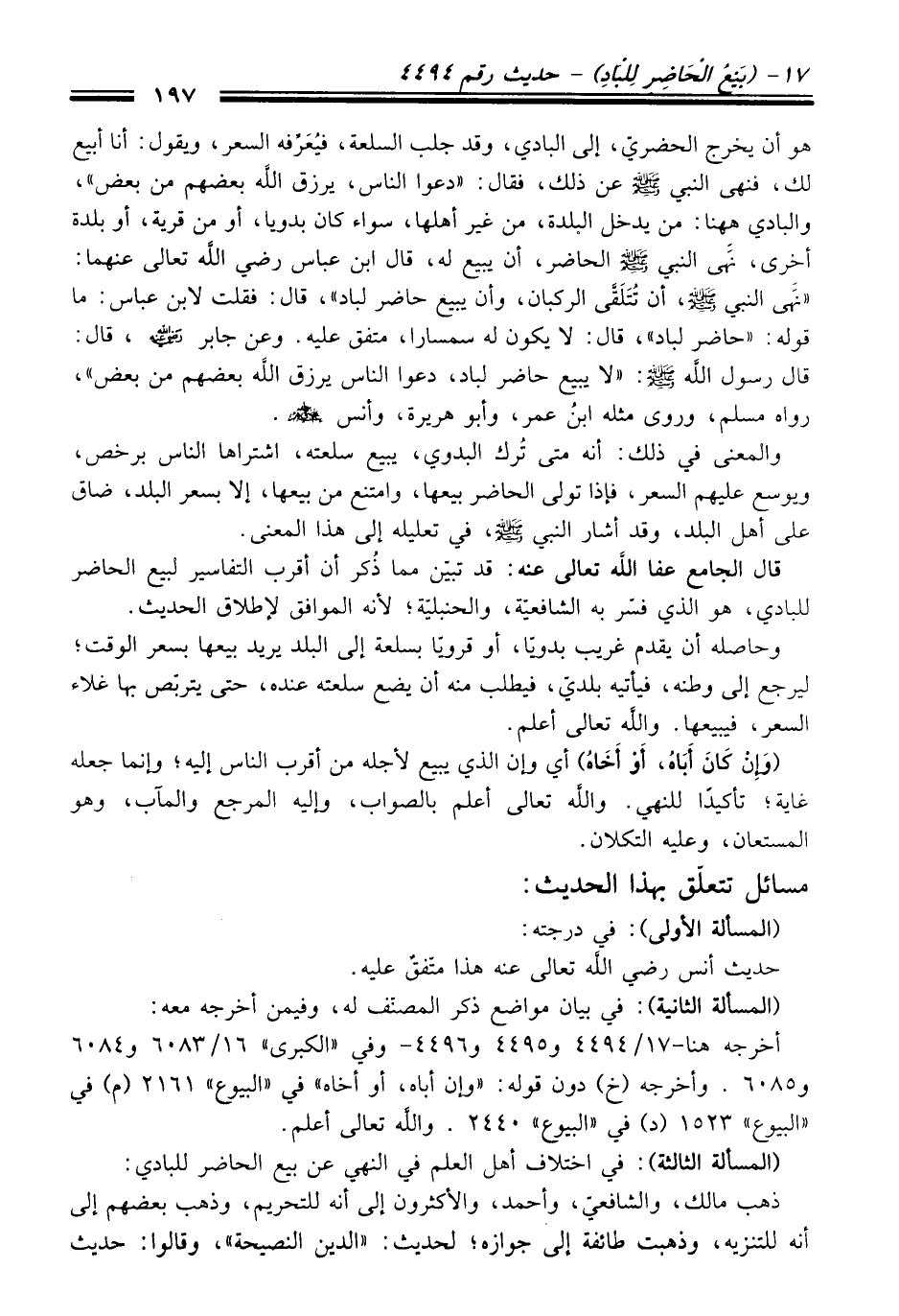 قَالَ الجامع عفا الله تعالى عنه: قد تبيّن مما ذُكر أن أقرب التفاسير لبيع الحاضر للبادي، هو الذي فسّر به الشافعية، والحنبليّة؛ لأنه الموافق لإطلاق الْحَدِيث.