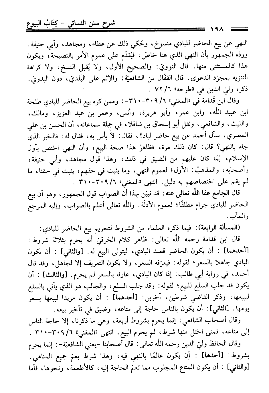 وَقَالَ ابن قُدامة فِي "المغني" 6/ 309 - 310 - : وممن كره بيع الحاضر للبادي طلحة ابن عبيد الله، وابن عمر، وأبو هريرة، وأنس، وعمر بن عبد العزيز، ومالك، والليث، والشافعي، ونقل أبو إسحاق بن شاقلا، فِي جملة سماعاته، أن الحسن بن علي المصريّ، سأل أحمد عن بيع حاضر لباد؟، فَقَالَ: لا بأس به، فَقَالَ له: فالخبر الذي جاء بالنهي؟ قَالَ: كَانَ ذلك مرة، فظاهرُ هَذَا صحة البيع، وأن النهي اختص بأول الإِسلام، لِمَا كَانَ عليهم منْ الضيق فِي ذلك، وهذا قول مجاهد، وأبي حنيفة، وأصحابه، والمذهبُ: الأول؛ لعموم النهي، وما يثبت فِي حقهم، يثبت فِي حقنا، ما لم يقم عَلَى اختصاصهم به دليل. انتهى "المغني" 6/ 309 - 310.