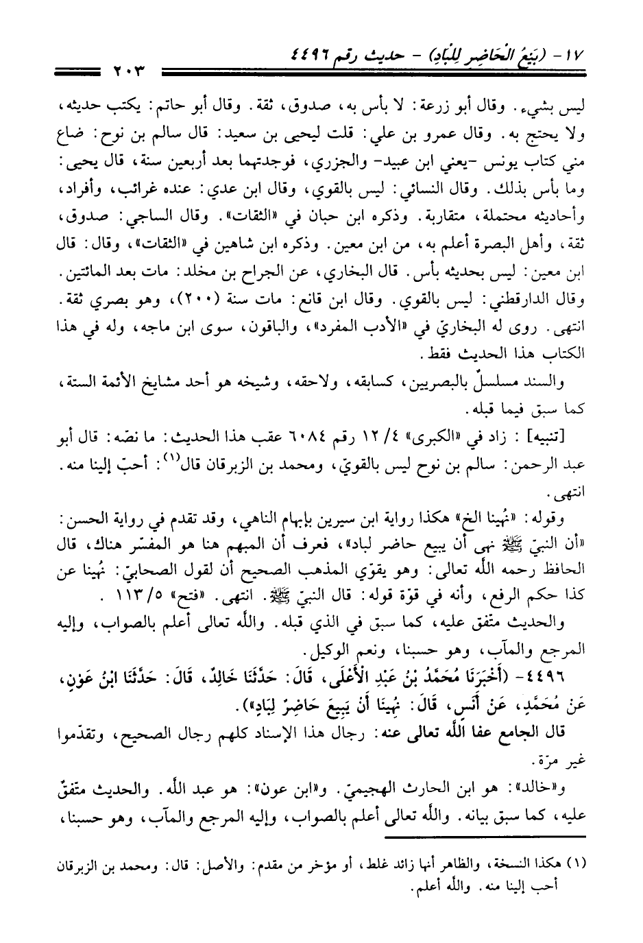 4496 - (أَخْبَرَنَا مُحَمَّدُ بْنُ عَبْدِ الأَعْلَى، قَالَ: حَدَّثَنَا خَالِدٌ، قَالَ: حَدَّثَنَا ابْنُ عَوْنٍ، عَنْ مُحَمَّدٍ، عَنْ أَنَسٍ، قَالَ: نُهِينَا أَنْ يَبِيعَ حَاضِرٌ لِبَادٍ").