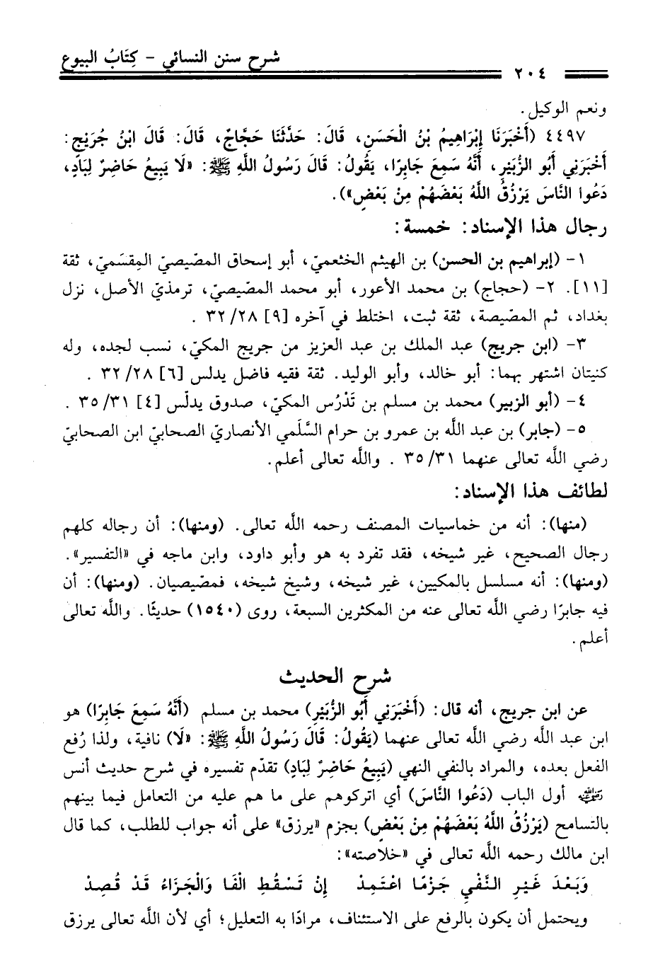 4497 - (أَخْبَرَنَا إِبْرَاهِيمُ بْنُ الْحَسَنِ، قَالَ: حَدَّثَنَا حَجَّاجٌ، قَالَ: قَالَ ابْنُ جُرَيْجٍ: أَخْبَرَنِي أَبُو الزُّبَيْرِ، أَنَّهُ سَمِعَ جَابِرًا، يَقُولُ: قَالَ رَسُولُ اللَّهِ -صلى الله عليه وسلم-: "لاَ يَبِيعُ حَاضِرٌ لِبَادٍ، دَعُوا النَّاسَ يَرْزُقُ اللَّهُ بَعْضَهُمْ مِنْ بَعْضٍ").