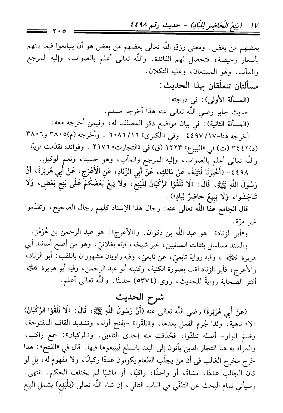 (عَنْ أَبِي هُرَيْرَةَ) رضي الله تعالى عنه (أَنَّ رَسُولَ اللَّهِ -صلى الله عليه وسلم-، قَالَ: "لاَ تَلَقُّوا الرُّكْبَانَ) "لا" ناهية، ولذا جُزم الفعل بعدها، و"تلقوا" -بفح أوله، وتشديد القاف المفتوحة، وضمّ الواو- أصله تتلقّوا، فحُذفت منه إحدى التاءين. و"الركبان": جمع راكب، والمراد به هنا التجار الذين يأتون إلى البلد بالسلع ليبيعوها فيها. قَالَ فِي "الفتح": هَذَا خرج مخرج الغالب فِي أن منْ يجلُب الطعام يكونون عددًا ركبانًا، ولا مفهوم له، بل لو كَانَ الجالب عددًا، مشاةً، أو واحدًا، راكبًا، أو ماشيًا لم يختلف الحكم. انتهى. وسيأتي تمام البحث عن التلقّي فِي الباب التالي، إن شاء الله تعالى (لِلْبَيْعِ) يشمل البيع
