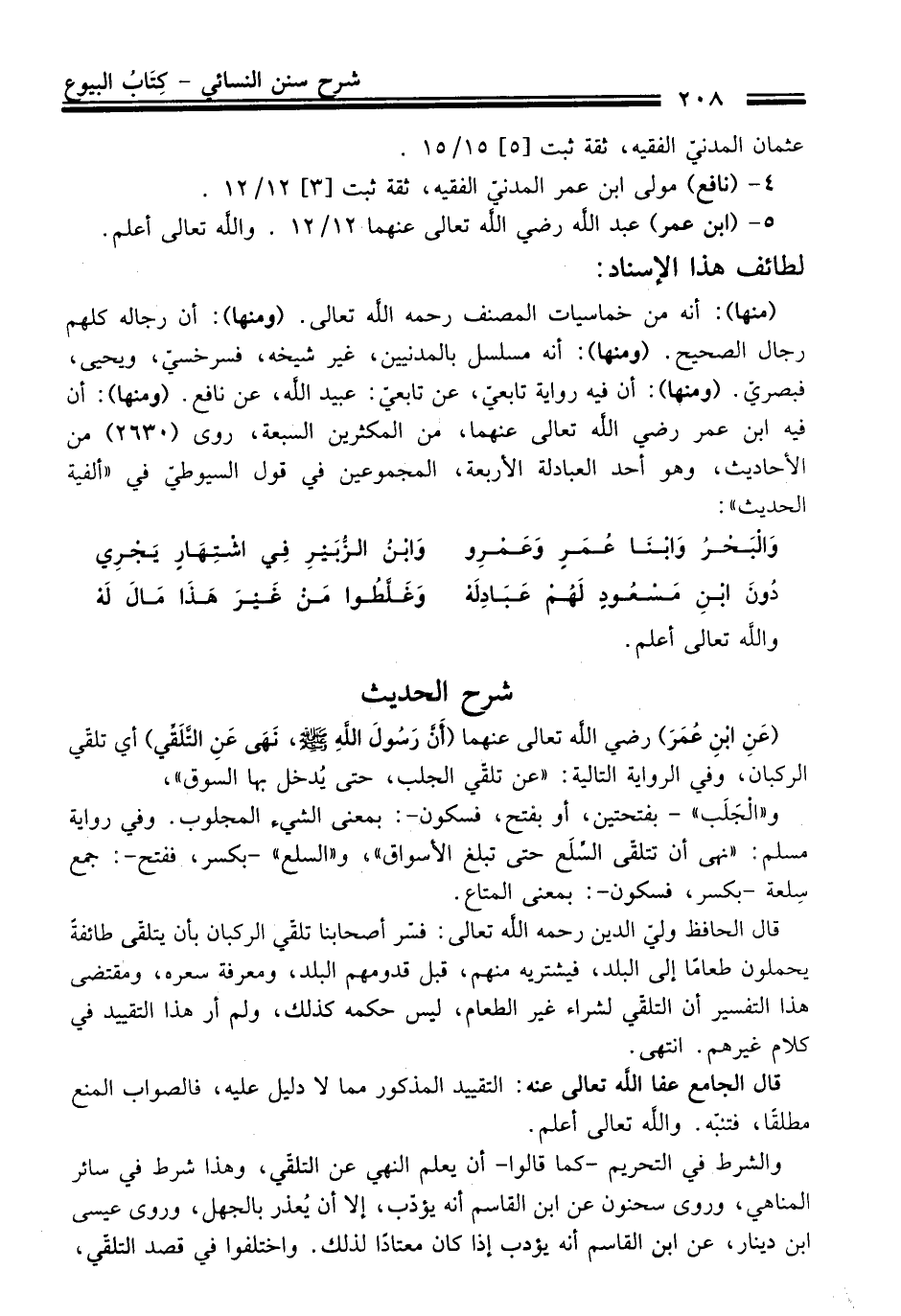 (عَنِ ابْنِ عُمَرَ) رضي الله تعالى عنهما (أَنَّ رَسُولَ اللَّهِ -صلى الله عليه وسلم- نَهَى عَنِ التَّلَقِّي) أي تلقّي الركبان، وفي الرواية التالية: "عن تلقّي الجلب، حَتَّى يُدخل بها السوق".
