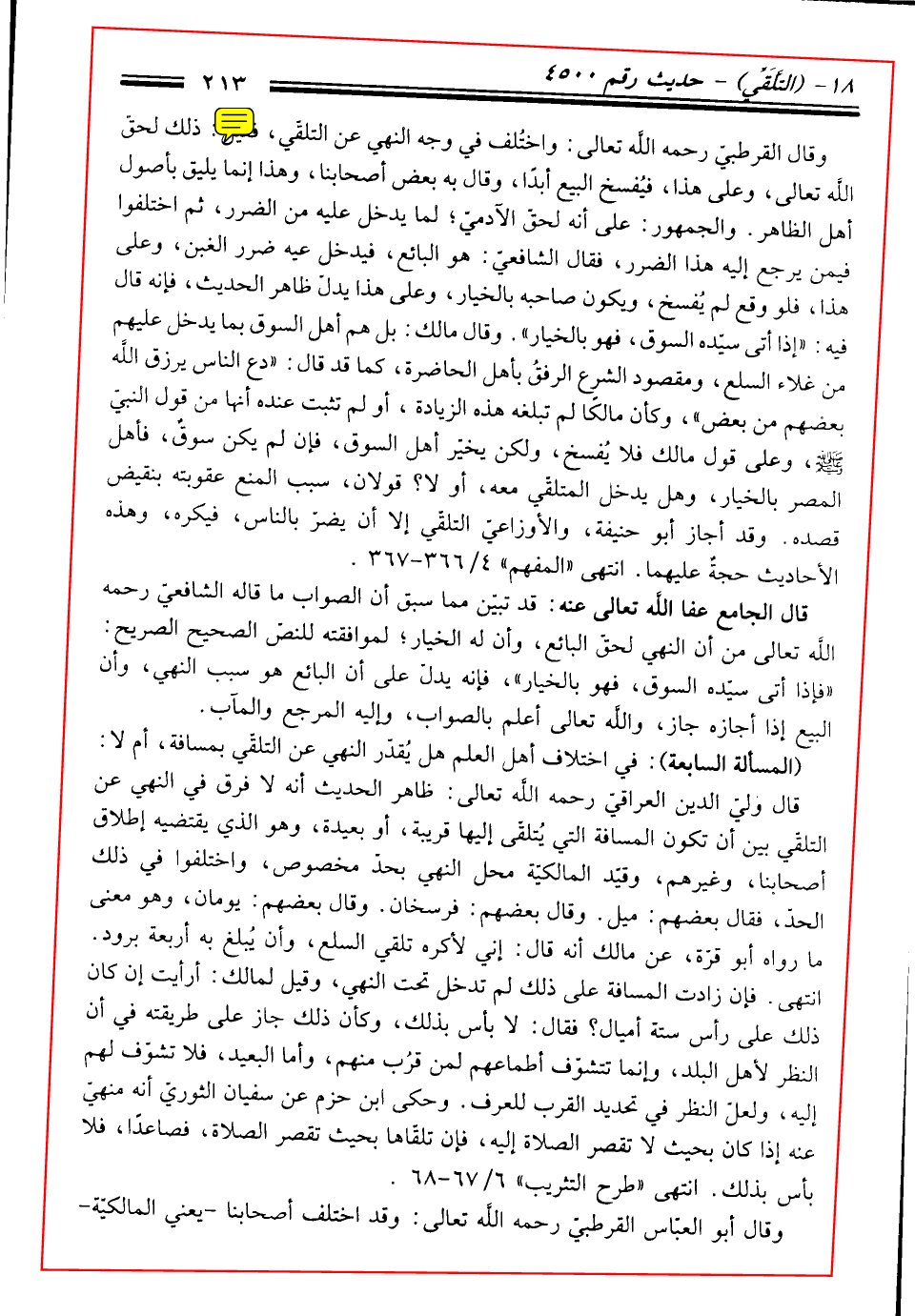 قَالَ وليّ الدين العراقيّ رحمه الله تعالى: ظاهر الْحَدِيث أنه لا فرق فِي النهي عن التلقّي بين أن تكون المسافة التي يُتلقّى إليها قريبة، أو بعيدة، وهو الذي يقتضيه إطلاق أصحابنا، وغيرهم، وقيد المالكية محل النهي بحدّ مخصوص، واختلفوا فِي ذلك الحدّ، فَقَالَ بعضهم: ميل. وَقَالَ بعضهم: فرسخان. وَقَالَ بعضهم: يومان، وهو معنى ما رواه أبو قرّة، عن مالك أنه قَالَ: إني لأكره تلقي السلع، وأن يُبلغ به أربعة برود. انتهى. فإن زادت المسافة عَلَى ذلك لم تدخل تحت النهي، وقيل لمالك: أرأيت إن كَانَ ذلك عَلَى رأس ستة أميال؟ فَقَالَ: لا بأس بذلك، وكأن ذلك جاز عَلَى طريقته فِي أن النظر لأهل البلد، وإنما تتشوّف أطماعهم لمن قرُب منهم، وأما البعيد، فلا تشوّف لهم إليه، ولعلّ النظر فِي تحديد القرب للعرف. وحكى ابن حزم عن سفيان الثوريّ أنه منهيّ عنه إذا كَانَ بحيث لا تقصر الصلاه إليه، فإن تلقّاها بحيث تقصر الصلاة، فصاعدًا، فلا بأس بذلك. انتهى "طرح التثريب" 6/ 67 - 68.