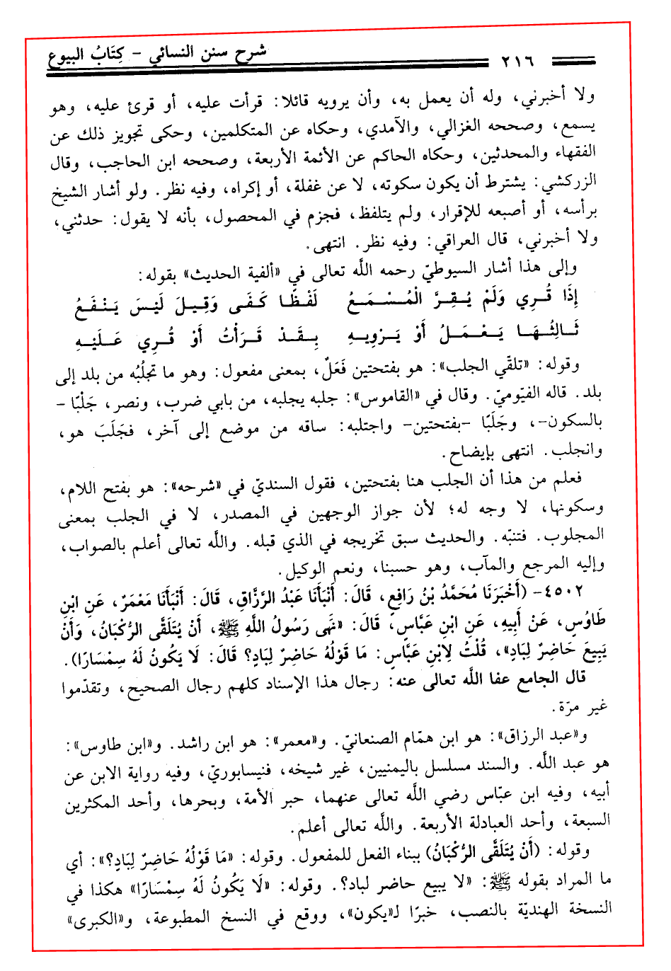4502 - (أَخْبَرَنَا مُحَمَّدُ بْنُ رَافِعٍ، قَالَ: أَنْبَأَنَا عَبْدُ الرَّزَّاقِ، قَالَ: أَنْبَأَنَا مَعْمَرٌ، عَنِ ابْنِ طَاوُسٍ، عَنْ أَبِيهِ، عَنِ ابْنِ عَبَّاسٍ، قَالَ: "نَهَى رَسُولُ اللَّهِ -صلى الله عليه وسلم-، أَنْ يُتَلَقَّى الرُّكْبَانُ، وَأَنْ يَبِيعَ حَاضِرٌ لِبَادٍ"، قُلْتُ لاِبْنِ عَبَّاسٍ: مَا قَوْلُهُ حَاضِرٌ لِبَادٍ؟ قَالَ: لاَ يَكُونُ لَهُ سِمْسَارًا).