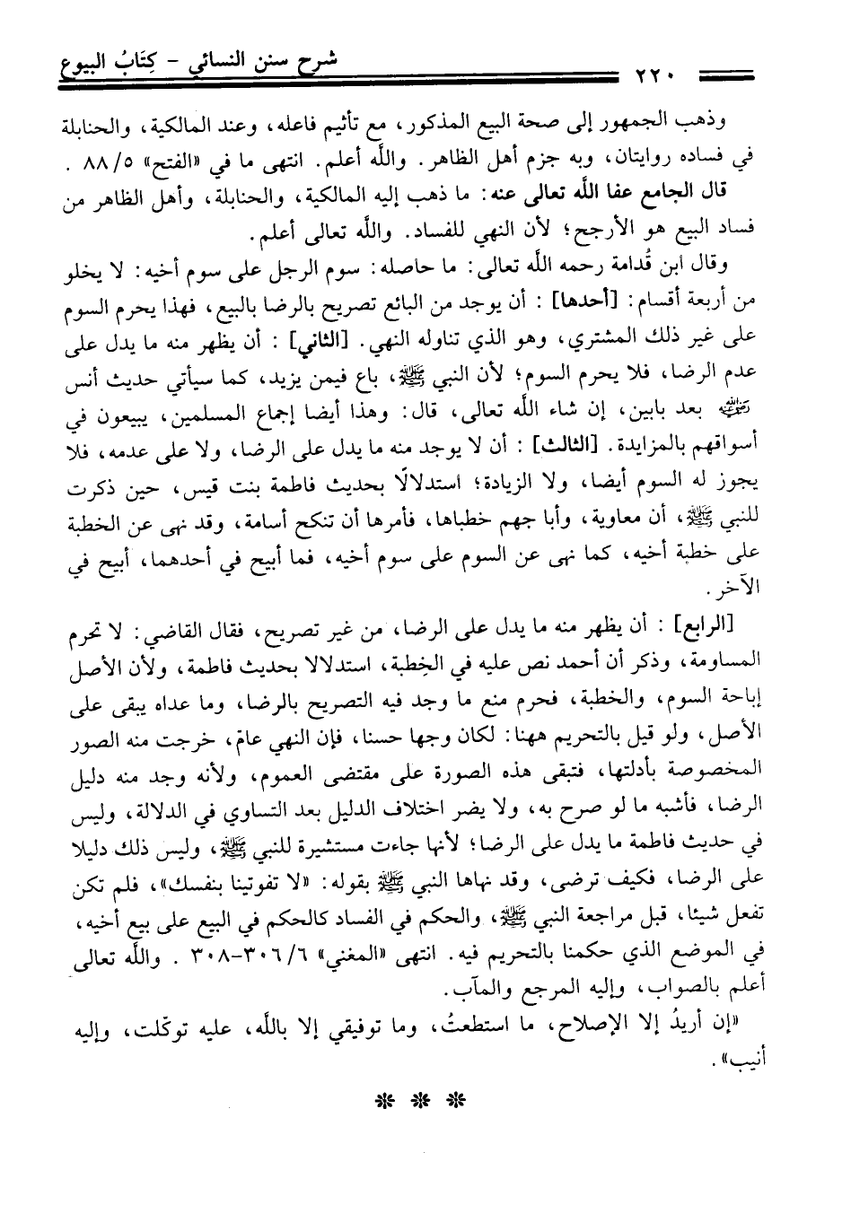 وَقَالَ ابن قُدامة رحمه الله تعالى: ما حاصله: سوم الرجل عَلَى سوم أخيه؛ لا يخلو منْ أربعة أقسام: [أحدها]: أن يوجد منْ البائع تصريح بالرضا بالبيع، فهذا يحرم السوم عَلَى غير ذلك المشتري، وهو الذي تناوله النهي. [الثاني]: أن يظهر منه ما يدل عَلَى عدم الرضا، فلا يحرم السوم؛ لأن النبيّ -صلى الله عليه وسلم-، باع فيمن يزيد، كما سيأتي حديث أنس -رضي الله عنه- بعد بابين، إن شاء الله تعالى، قَالَ: وهذا أيضًا إجماع المسلمين، يبيعون فِي أسواقهم بالمزايدة. [الثالث]: أن لا يوجد منه ما يدل عَلَى الرضا، ولا عَلَى عدمه، فلا يجوز له السوم أيضًا، ولا الزيادة؛ استدلالًا بحديث فاطمة بنت قيس، حين ذكرت للنبي -صلى الله عليه وسلم-، أن معاوية، وأبا جهم خطباها، فأمرها أن تنكح أسامة، وَقَدْ نهى عن الخطبة عَلَى خطبة أخيه، كما نهى عن السوم عَلَى سوم أخيه، فما أبيح فِي أحدهما، أبيح فِي الآخر.