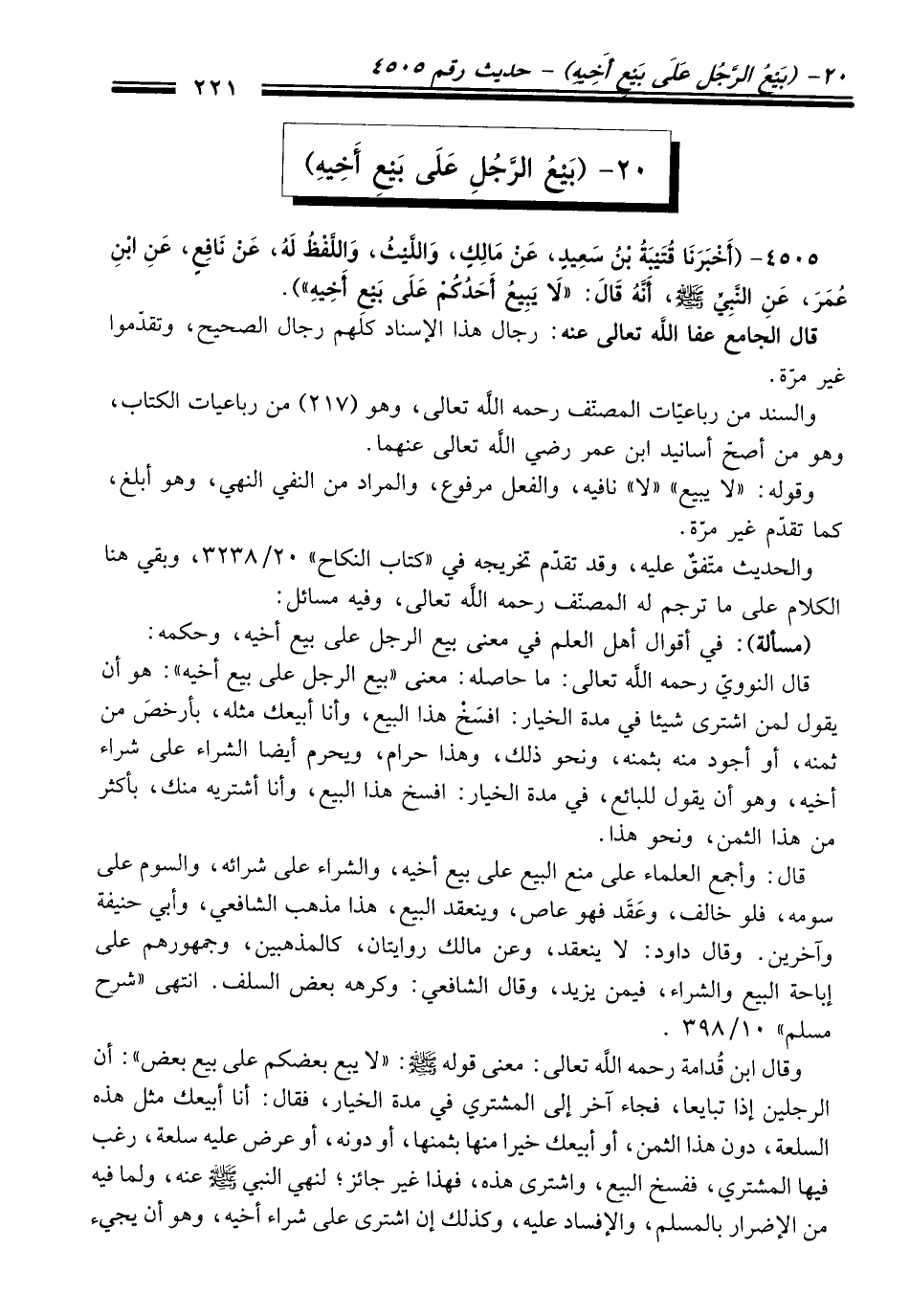 4505 - (أَخْبَرَنَا قُتَيْبَةُ بْنُ سَعِيدٍ، عَنْ مَالِكٍ، وَاللَّيْثِ، وَاللَّفْظُ لَهُ، عَنْ نَافِعٍ، عَنِ ابْنِ عُمَرَ، عَنِ النَّبِيِّ -صلى الله عليه وسلم-، أَنَّهُ قَالَ: "لاَ يَبِيعُ أَحَدُكُمْ عَلَى بَيْعِ أَخِيهِ").
