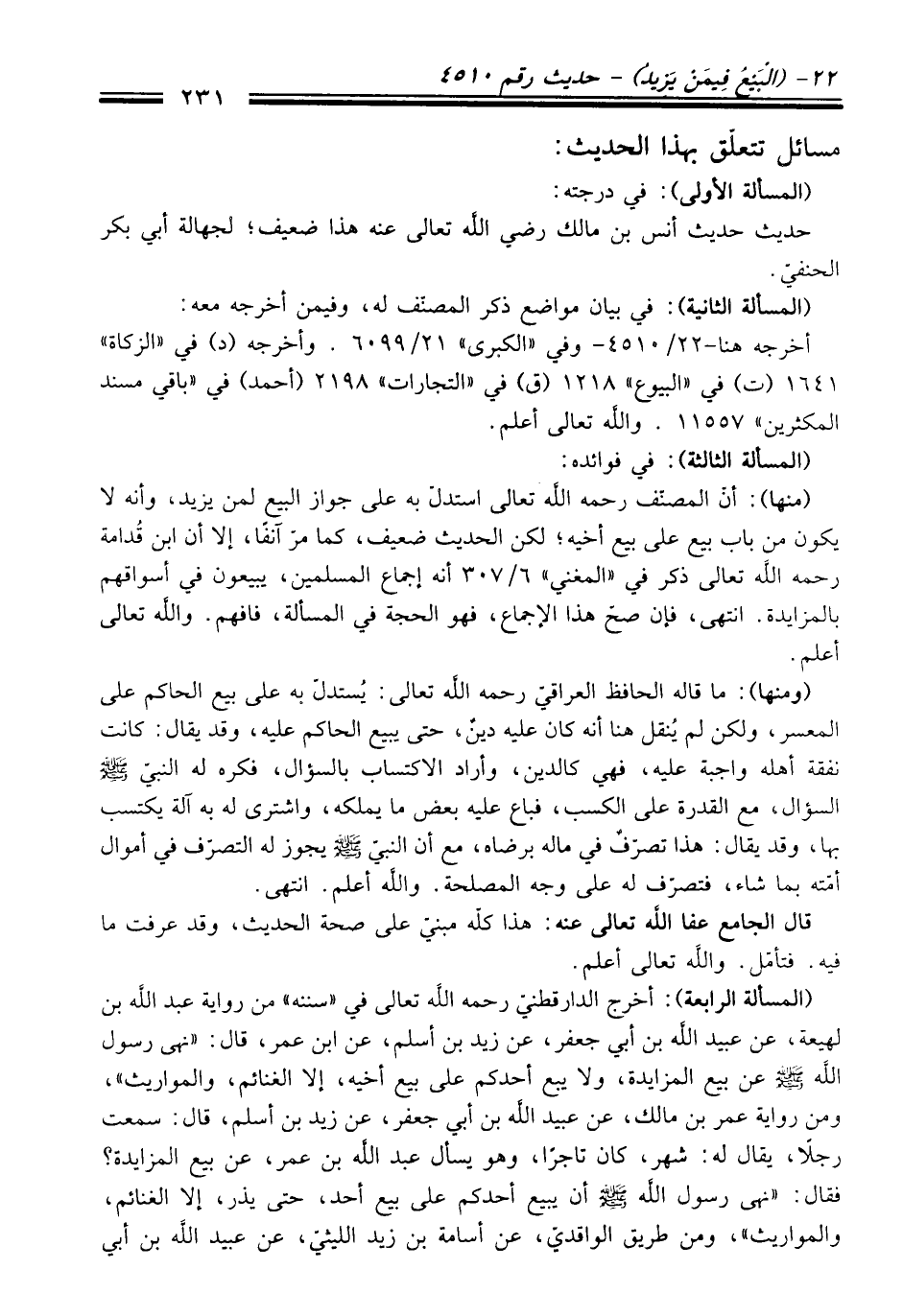 (المسألة الرابعة): أخرج الدارقطنيّ رحمه الله تعالى فِي "سننه" منْ رواية عبد الله بن لهيعة، عن عبيد الله بن أبي جعفر، عن زيد بن أسلم، عن ابن عمر، قَالَ: "نهى رسول الله -صلى الله عليه وسلم- عن بيع المزايدة، ولا يبع أحدكم عَلَى بيع أخيه، إلا الغنائم، والمواريث"، ومن رواية عمر بن مالك، عن عبيد الله بن أبي جعفر، عن زيد بن أسلم، قَالَ: سمعت رجلًا، يقال له: شهر، كَانَ تاجرًا، وهر يسأل عبد الله بن عمر، عن بيع المزايدة؟ فَقَالَ: "نهى رسول الله -صلى الله عليه وسلم- أن يبيع أحدكم عَلَى بيع أحد، حَتَّى يذر، إلا الغنائم، والمواريث"، ومن طريق الواقديّ، عن أسامة بن زيد الليثيّ، عن عبيد الله بن أبي