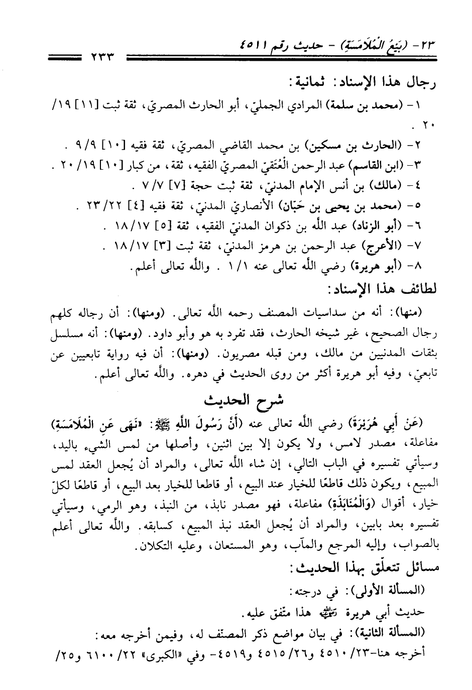 (عَنْ أَبِى هُرَيْرَةَ) رضي الله تعالى عنه (أَنَّ رَسُولَ اللَّهِ -صلى الله عليه وسلم-: "نَهَى عَنِ الْمُلاَمَسَةِ) مفاعلة، مصدر لامس، ولا يكون إلا بين اثنين، وأصلها منْ لمس الشيء باليد، وسيأتي تفسيره فِي الباب التالي، إن شاء الله تعالى، والمراد أن يُجعل العقد لمس المبيع، ويكون ذلك قاطعًا للخيار عند البيع، أو قاطعا للخيار بعد البيع، أو قاطعًا لكل خيار، أقوال (وَالْمُنَابَذَةِ) مفاعلة، فهو مصدر نابذ، منْ النبذ، وهو الرمي، وسيأتي تفسيره بعد بابين، والمراد أن يُجعل العقد نبذ المبيع، كسابقه. والله تعالى أعلم بالصواب، وإليه المرجع والمآب، وهو المستعان، وعليه التكلان.