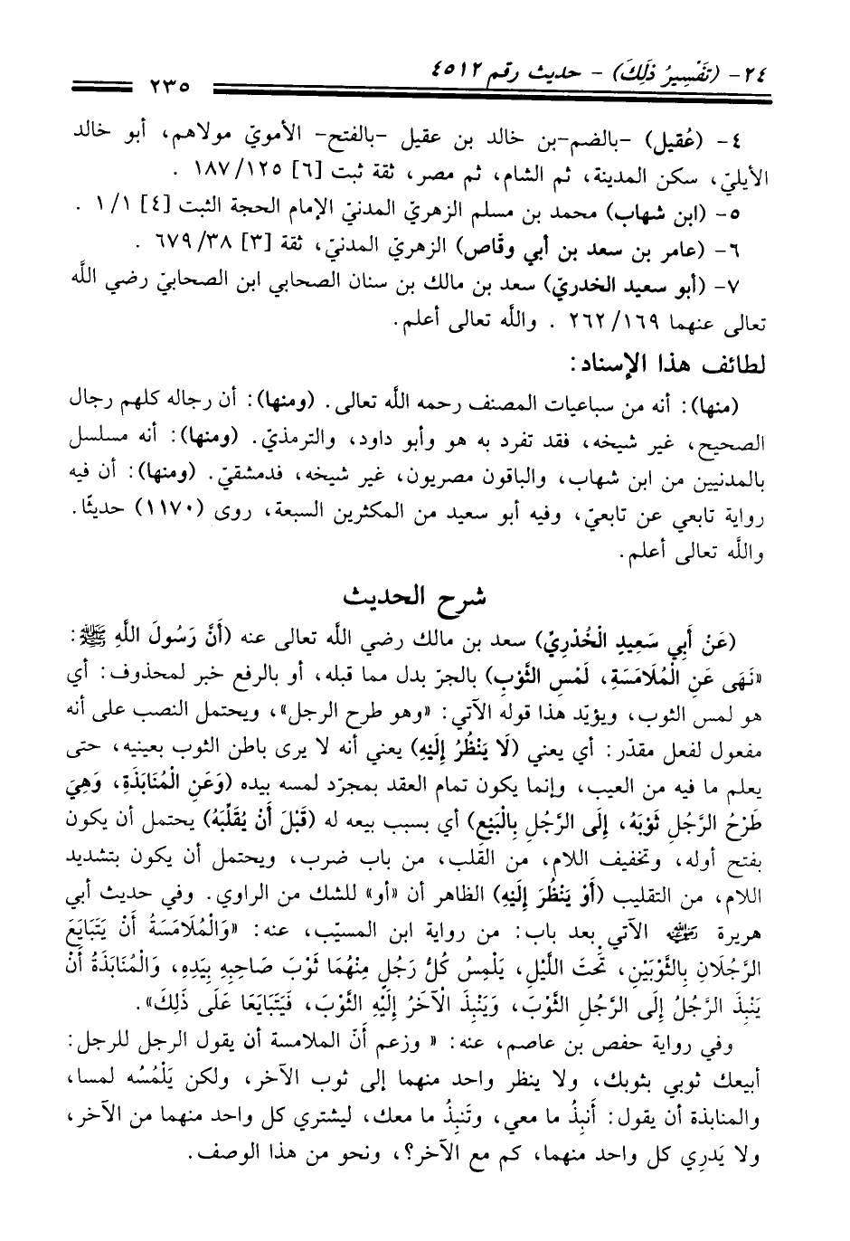 (عَنْ أَبِي سَعِيدٍ الْخُدْرِيِّ) سعد بن مالك رضي الله تعالى عنه (أَنَّ رَسُولَ اللَّهِ -صلى الله عليه وسلم-: "نَهَى عَنِ الْمُلاَمَسَةِ، لَمْسِ الثَّوْبِ) بالجرّ بدل مما قبله، أو بالرفع خبر لمحذوف: أي هو لمس الثوب، ويؤيّد هَذَا قوله الآتي: "وهو طرح الرجل"، ويحتمل النصب عَلَى أنه مفعول لفعل مقدّر: أي يعني (لا يَنْظُرُ إِلَيْهِ) يعني أنه لا يرى باطن الثوب بعينيه، حَتَّى يعلم ما فيه منْ العيب، وإنما يكون تمام العقد بمجرّد لمسه بيده (وَعَنِ الْمُنَابَذَةِ، وَهِيَ طَرْحُ الرَّجُلِ ثَوْبَهُ، إِلَى الرَّجُلِ بِالْبَيْعِ) أي بسبب بيعه له (قَبْلَ أَنْ يُقَلِّبَهُ) يحتمل أن يكون بفتح أوله، وتخفيف اللام، منْ القلب، منْ باب ضرب، ويحتمل أن يكون بتشديد اللام، منْ التقليب (أَوْ يَنْظُرَ إِلَيْهِ) الظاهر أن "أو" للشك منْ الراوي. وفي حديث أبي هريرة -رضي الله عنه- الآتي بعد باب: منْ رواية ابن المسيب، عنه: "وَالْمُلاَمَسَةُ أَنْ يَتَبَايَعَ الرَّجُلاَنِ بِالثَّوْبَيْنِ، تَحْتَ اللَّيْلِ، يَلْمِسُ كُلُّ رَجُلٍ مِنْهُمَا ثَوْبَ صَاحِبِهِ بِيَدِهِ، وَالْمُنَابَذَةُ أَنْ يَنْبِذَ الرَّجُلُ إِلَى الرَّجُلِ الثَّوْبَ، وَيَنْبُذَ الآخَرُ إِلَيْهِ الثَّوْبَ، فَيَتَبَايَعَا عَلَى ذَلِكَ".