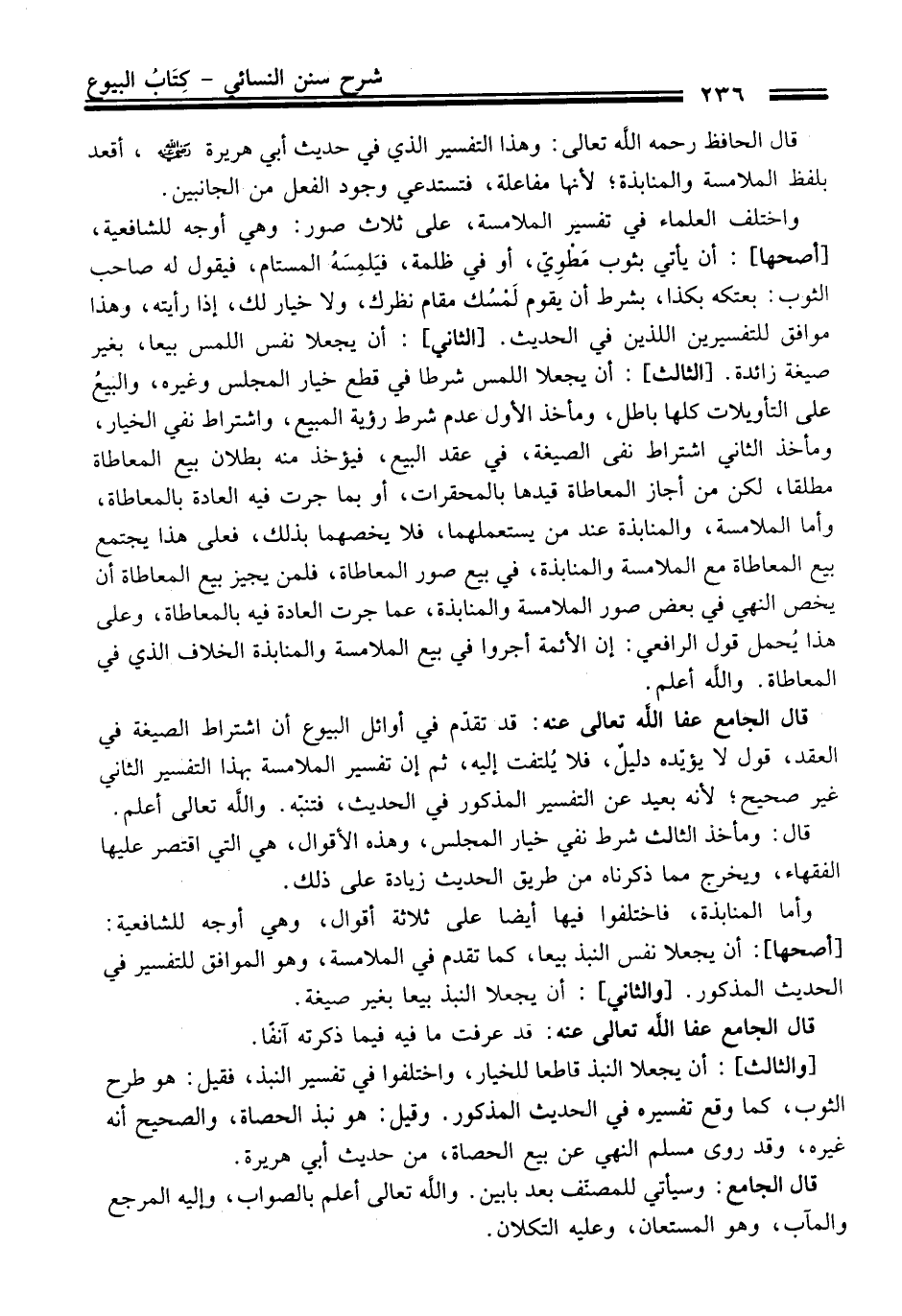 قَالَ الجامع عفا الله تعالى عنه: قد تقدّم فِي أوائل البيوع أن اشتراط الصيغة فِي العقد، قول لا يؤيده دليلٌ، فلا يُلتفت إليه، ثم إن تفسير الملامسة بهذا التفسير الثاني غير صحيح؛ لأنه بعيد عن التفسير المذكور فِي الْحَدِيث، فتنبّه. والله تعالى أعلم.