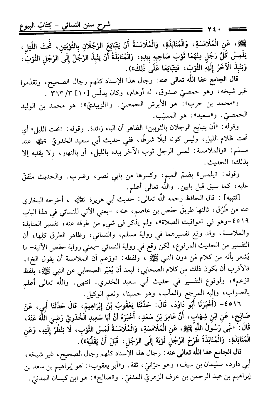 [تنبيه]: قَالَ الحافظ رحمه الله تعالى: حديث أبي هريرة -رضي الله عنه-، أخرجه البخاريّ عنه منْ طُرُق، ثالثها طريق حفص بن عاصم، عنه، -يعني الآتي للنسائي فِي هَذَا الباب 4519 - وهو فِي "مواقيت الصلاة"، ولم يذكر فِي شيء منْ طرقه عنه، تفسير المنابذة والملامسة، وَقَدْ وقع تفسيرهما فِي رواية مسلم، والنسائي، وظاهر الطرق كلها، أن التفسير منْ الْحَدِيث المرفوع، لكن وقع فِي رواية النسائيّ -يعني رواية حفص الآتية- ما يُشعر بأنه منْ كلام منْ دون النبيّ -صلى الله عليه وسلم-، ولفظه: "وزعم أن الملامسة أن يقول الخ"، فالأقرب أن يكون ذلك منْ كلام الصحابيّ؛ لبعد أن يُعَبّر الصحابيّ عن النبيّ -صلى الله عليه وسلم-، بلفظ "زعم"، ولوقوع التفسير فِي حديث أبي سعيد الخدريّ. انتهى. والله تعالى أعلم بالصواب، وإليه المرجع والمآب، وهو حسبنا، ونعم الوكيل.