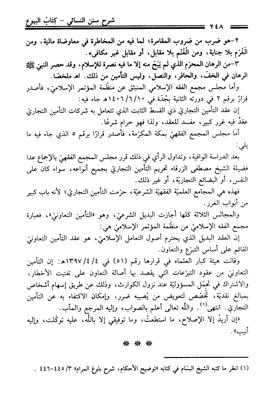 بعد الدراسة الوافية، وتداول الرأي فِي ذلك قرر مجلس المجمع الفقهيّ بالإجماع عدا فضيلة الشيخ مصطفى الزرقاء تحريم التأمين التجاريّ بجميع أنواعه، سواء كَانَ عَلَى النفس، أو البضائع التجارية، أو غير ذلك.