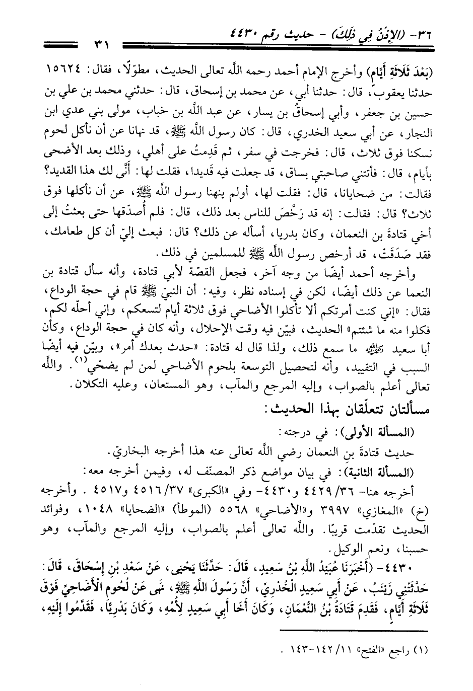 (بَعْدَ ثَلَاَثَةِ أَيَّامٍ) وأخرج الإِمام أحمد رحمه الله تعالى الْحَدِيث، مطوّلاً، فَقَالَ: 15624 - حدثنا يعقوب، قَالَ: حدثنا أبي، عن محمد بن إسحاق، قَالَ: حدثني محمد بن علي بن حسين بن جعفر، وأبي إسحاقُ بن يسار، عن عبد الله بن خباب، مولى بني عدي ابن النجار، عن أبي سعيد الخدريّ، قَالَ: كَانَ رسول الله -صلى الله عليه وسلم-، قد نهانا عن أن نأكل لحوم نسكنا فوق ثلاث، قَالَ: فخرجت فِي سفر، ثم قَدِمتُ عَلَى أهلي، وذلك بعد الأضحى بأيام، قَالَ: فأتتني صاحبتي بساق، قد جعلت فيه قَديدا، فقلت لها: أَنَّى لك هَذَا القديد؟ فقالت: منْ ضحايانا، قَالَ: فقلت لها، أولم ينهنا رسول الله -صلى الله عليه وسلم-، عن أن نأكلها فوق ثلاث؟ قَالَ: فقالت: إنه قد رَخَّصَ للناس بعد ذلك، قَالَ: فلم أُصدّقها حَتَّى بعثتُ إلى أخي قتادةَ بن النعمان، وكان بدريا، أسأله عن ذلك؟ قَالَ: فبعث إليّ أن كل طعامك، فقد صَدَقَتْ، قد أرخص رسول الله -صلى الله عليه وسلم- للمسلمين فِي ذلك.