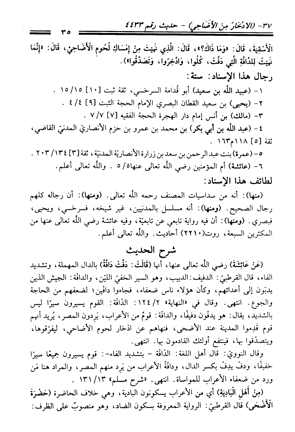الأَسْقِيَةَ، قَالَ: "وَمَا ذَاكَ؟ "، قَالَ: الَّذِي نَهَيْتَ مِنْ إِمْسَاكِ لُحُومِ الأَضَاحِيِّ، قَالَ: "إِنَّمَا نَهَيْتُ لِلدَّافَّةِ الَّتِي دَفَّتْ، كُلُوا، وَادَّخِرُوا، وَتَصَدَّقُوا").