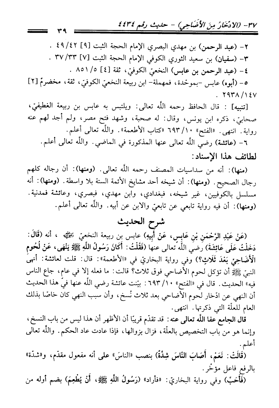 (عَنْ عَبْدِ الرَّحْمَنِ بْنِ عَابِسٍ، عَنْ أَبِيهِ) عابس بن ربيعة النخعيّ -رضي الله عنه-، أنه (قَالَ: دَخَلْتُ عَلَى عَائِشَةَ) رضي الله تعالى عنها (فَقُلْتُ: أَكَانَ رَسُولُ اللهِ -صلى الله عليه وسلم- يَنْهَى، عَنْ لُحُومِ الأَضَاحِيِّ بَعْدَ ثَلَاثٍ؟) وفي رواية البخاريّ فِي "الأطعمة": قَالَ: قلت لعائشة: أنهى النبيّ -صلى الله عليه وسلم- أن تؤكل لحوم الأضاحي فوق ثلاث؟ قالت: ما فعله إلا فِي عامٍ، جاع النَّاس فيه" الْحَدِيث. قَالَ فِي "الفتح" 10/ 693: بيّنت عائشة رضي الله عنها فِي هَذَا الْحَدِيث أن النهي عن ادّخار لحوم الأضاحي بعد ثلاث نُسخ، وأن سبب النهي كَانَ خاصًّا بذلك العام للعلّة التي ذكرتها. انتهى.