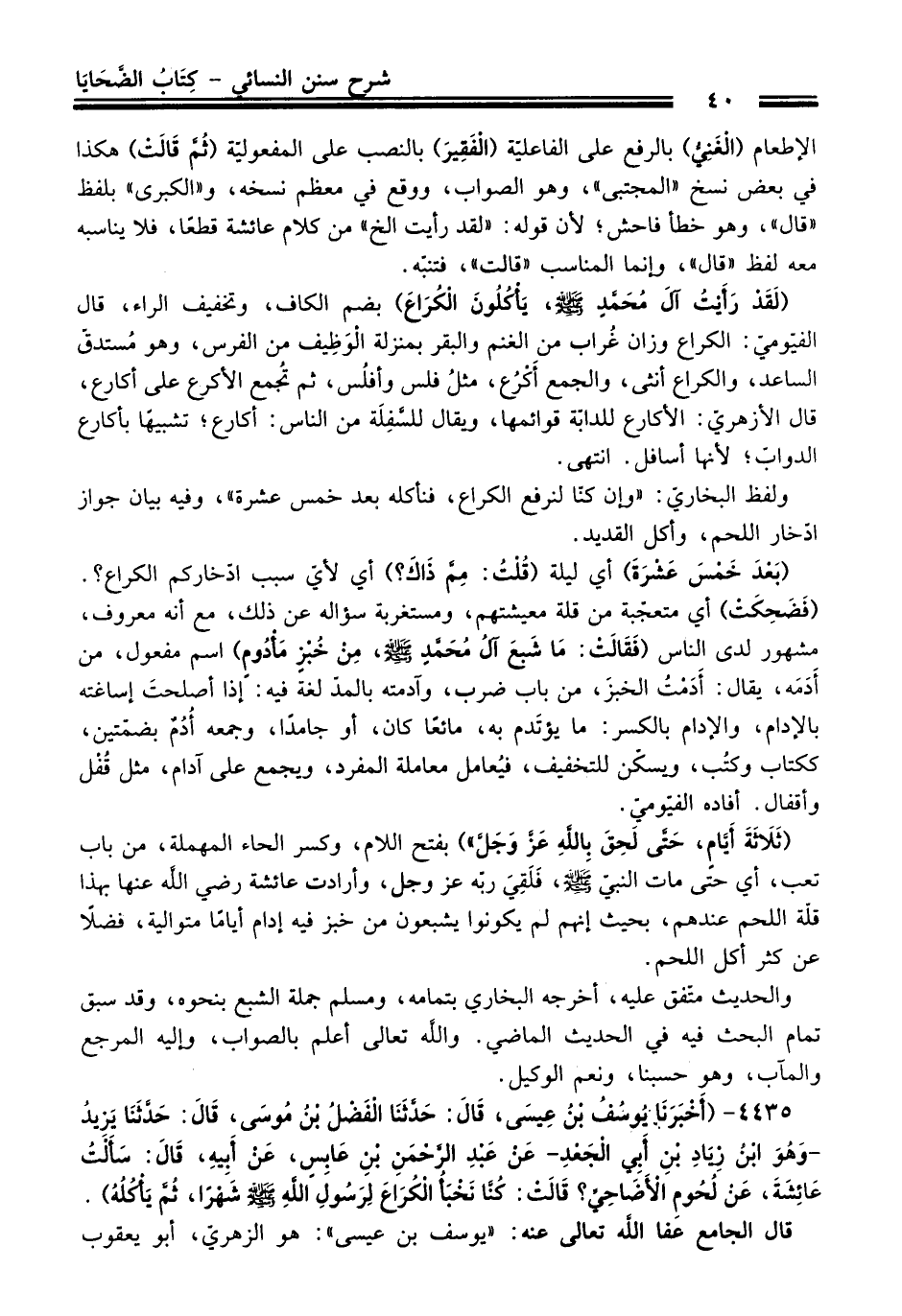 4435 - (أَخْبَرَنَا يُوسُفُ بْنُ عِيسَى، قَالَ: حَدَّثَنَا الْفَضْلُ بْنُ مُوسَى، قَالَ: حَدَّثَنَا يَزِيدُ -وَهُوَ ابْنُ زِيَادِ بْنِ أَبِي الْجَعْدِ- عَنْ عَبْدِ الرَّحْمَنِ بْنِ عَابِسٍ، عَنْ أَبِيهِ، قَالَ: سَأَلْتُ عَائِشَةَ، عَنْ لُحُومِ الأَضَاحِيِّ؟ قَالَتْ: كُنَّا نَخْبَأُ الْكُرَاعَ لِرَسُولِ اللَّهِ -صلى الله عليه وسلم- شَهْرًا، ثُمَّ يَأْكُلُهُ).