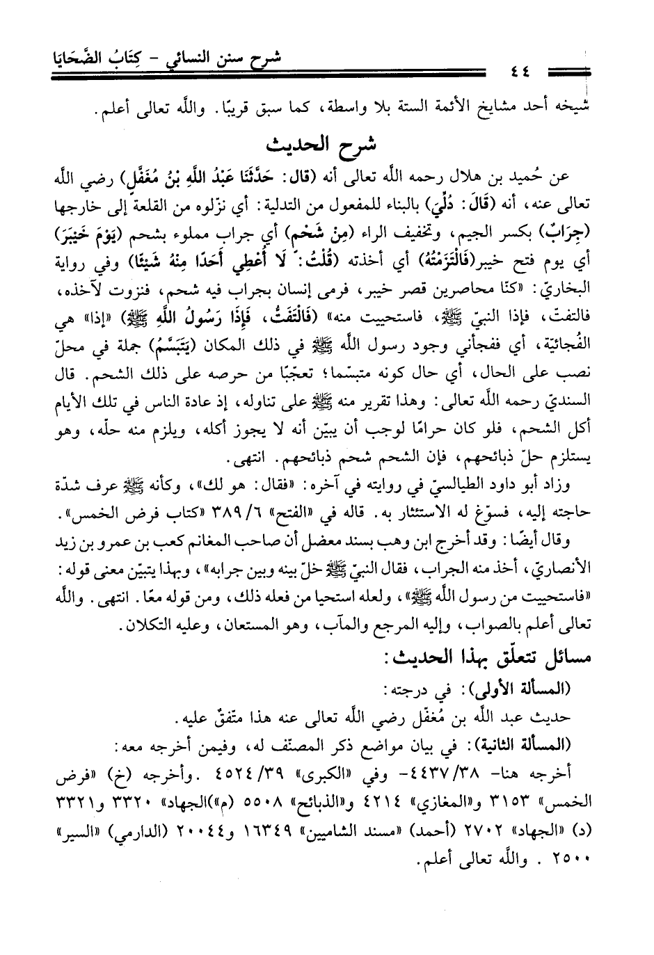عن حُميد بن هلال رحمه الله تعالى أنه (قَالَ: حَدَّثَنَا عَبْدُ اللهِ بْنُ مُغَفَّلٍ) رضي الله تعالى عنه، أنه (قَالَ: دُلِّيَ) بالبناء للمفعول منْ التدلية: أي نزّلوه منْ القلعة إلى خارجها (جِرَابٌ) بكسر الجيم، وتخفيف الراء (مِنْ شَحْمٍ) أي جراب مملوء بشحم (يَوْمَ خَيْبَرَ) أي يوم فتح خيبر (فَالْتَزَمْتُهُ) أي أخذته (قُلْتُ: لَا أُعْطِي أَحَدًا مِنْهُ شَيْئًا) وفي رواية البخاريّ: "كنّا محاصرين قصر خيبر، فرمى إنسان بجراب فيه شحم، فنزوت لآخذه، فالتفتّ، فإذا النبيّ -صلى الله عليه وسلم-، فاستحييت منه" (فَالْتَفَتُّ، فَإِذَا رَسُولُ اللهِ -صلى الله عليه وسلم-) "إذا" هي الفُجائيّة، أي ففجأني وجود رسول الله -صلى الله عليه وسلم- فِي ذلك المكان (يَتَبَسَّمُ) جملة فِي محلّ نصب عَلَى الحال، أي حال كونه متبسّمًا؛ تعجّبًا منْ حرصه عَلَى ذلك الشحم. قَالَ السنديّ رحمه الله تعالى: وهذا تقرير منه -صلى الله عليه وسلم- عَلَى تناوله، إذ عادة النَّاس فِي تلك الأيام أكل الشحم، فلو كَانَ حرامًا لوجب أن يبيّن أنه لا يجوز أكله، ويلزم منه حلّه، وهو يستلزم حلّ ذبائحهم، فإن الشحم شحم ذبائحهم. انتهى.