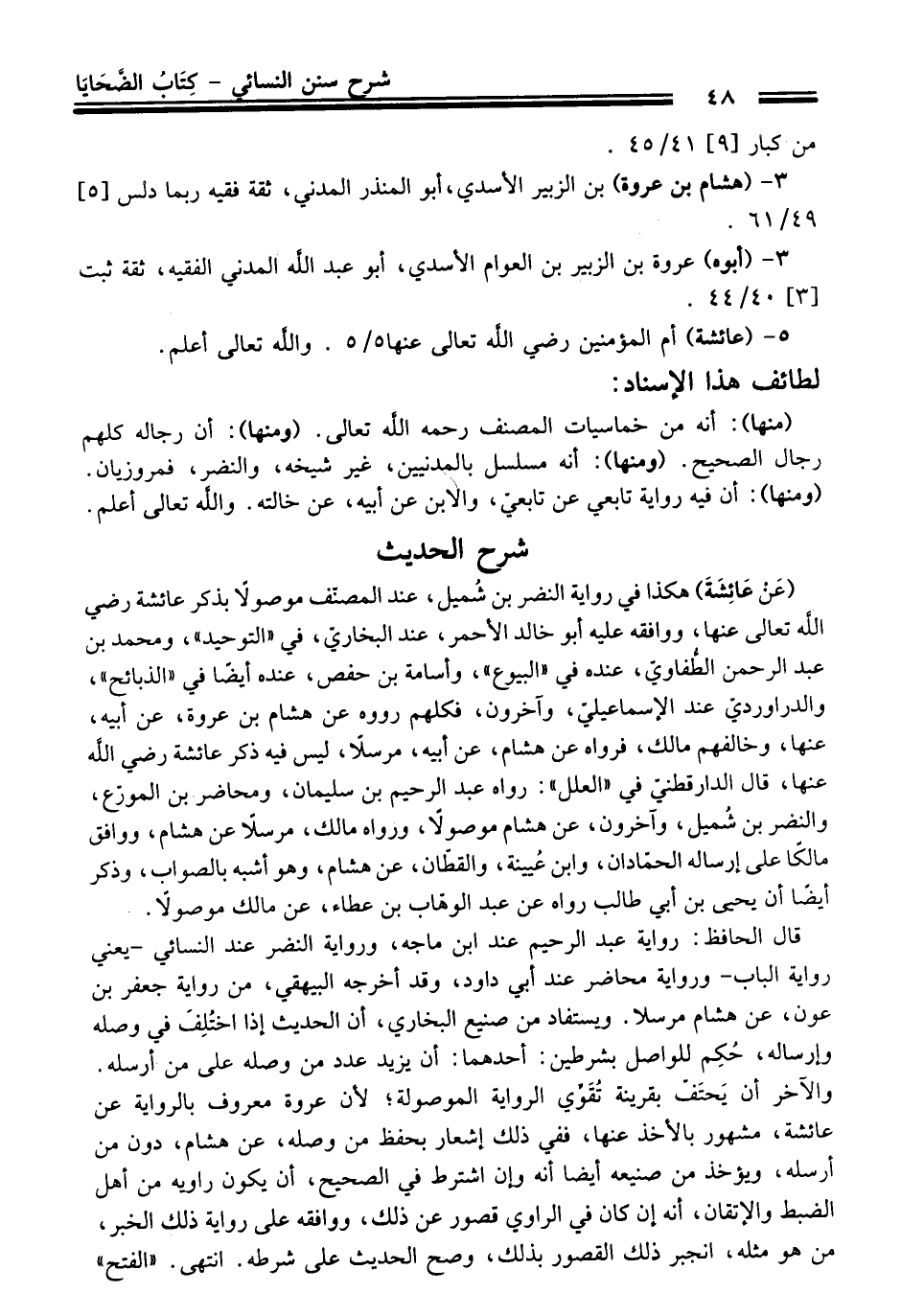 (عَنْ عَائِشَةَ) هكذا فِي رواية النضر بن شُميل، عند المصنّف موصولاً بذكر عائشة رضي الله تعالى عنها، ووافقه عليه أبو خالد الأحمر، عند البخاريّ، فِي "التوحيد"، ومحمد بن عبد الرحمن الطُّفاويّ، عنده فِي "البيوع"، وأسامة بن حفص، عنده أيضاً فِي "الذبائح"، والدراورديّ عند الإسماعيليّ، وآخرون، فكلهم رووه عن هشام بن عروة، عن أبيه، عنها، وخالفهم مالك، فرواه عن هشام، عن أبيه، مرسلاً، ليس فيه ذكر عائشة رضي الله عنها، قَالَ الدارقطنيّ فِي "العلل": رواه عبد الرحيم بن سليمان، ومحاضر بن المورّع، والنضر بن شُميل، وآخرون، عن هشام موصولاً، ورواه مالك، مرسلاً عن هشام، ووافق مالكًا عَلَى إرساله الحمّادان، وابن عُيينة، والقطّان، عن هشام، وهو أشبه بالصواب، وذكر أيضًا أن يحيى بن أبي طالب رواه عن عبد الوهّاب بن عطاء، عن مالك موصولاً.